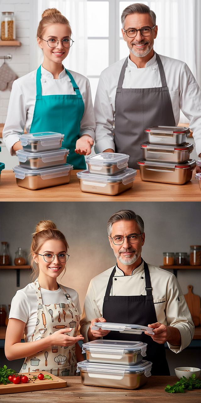 Fabricados en Corea con Acero Inoxidable 18/8 304. Ligeros, resistentes y ecológicos. Anti bacterias y libre de olores y BPA. Aptos lavavajillas, congelador, horno y microondas. Temperaturas de -40º a 400º. Tapa trasparente PP5 con junta de silicona, apilables entre sí. Aprobado por la FDA.