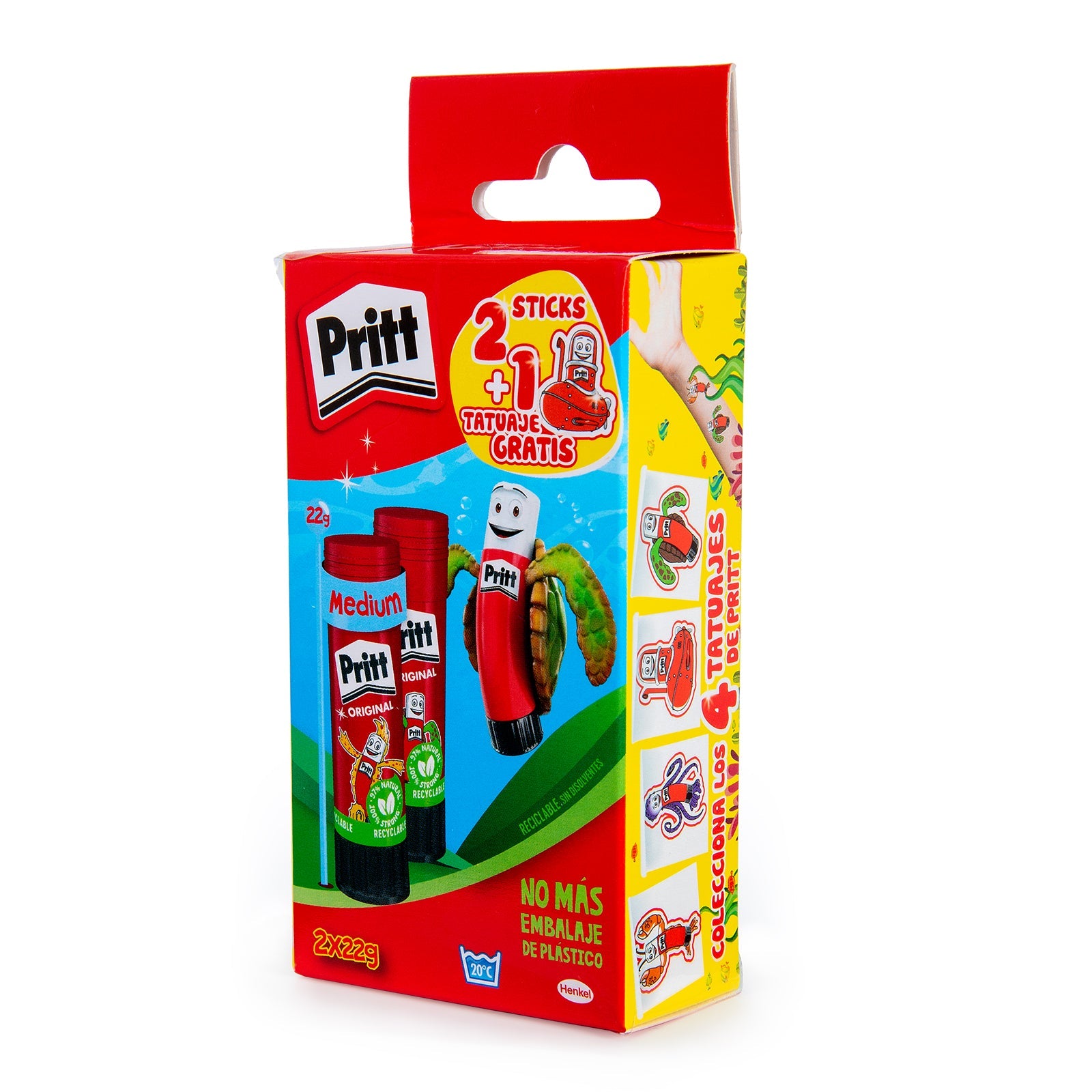 Viene presentado en un blíster sin plástico, un nuevo formato de embalaje hecho hasta un 85% de cartón reciclado y es 100% reciclable. De esta manera Pritt contribuye a reducir el uso de plástico en 1000 toneladas al año.