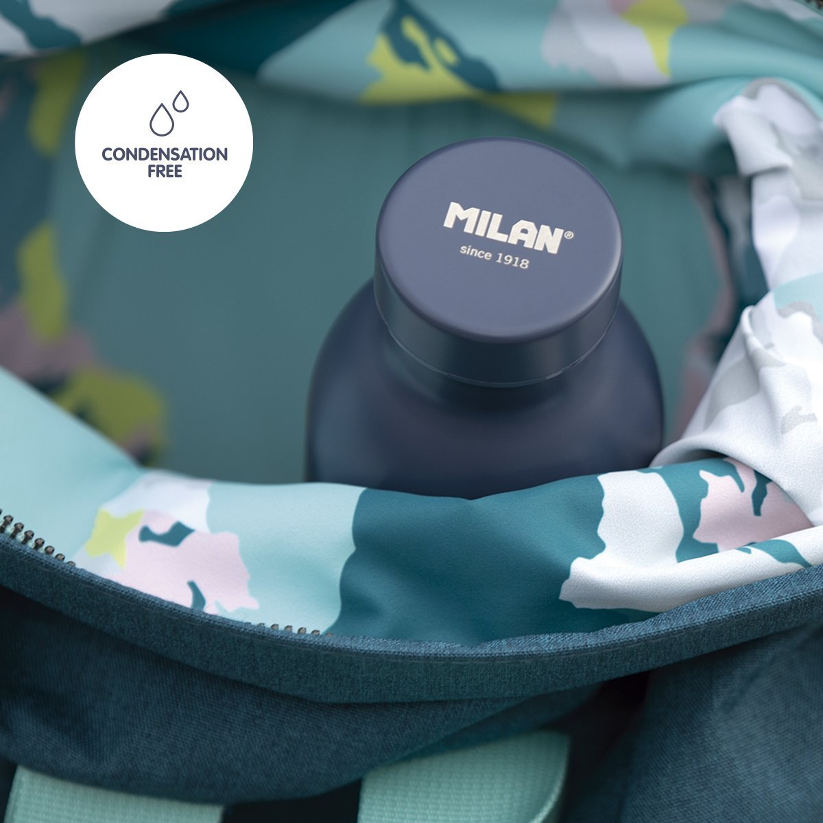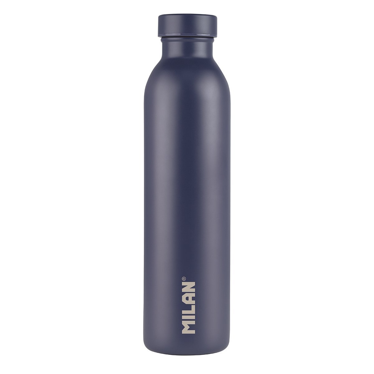 Botella de agua térmica MILAN 1918 fabricada en acero inoxidable, con doble pared de vacío que mantiene la temperatura del contenido hasta 12h con líquidos calientes y 24h con líquidos fríos.