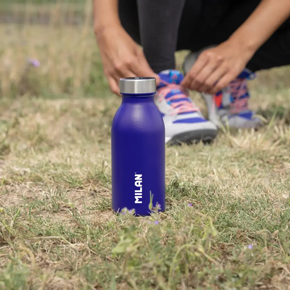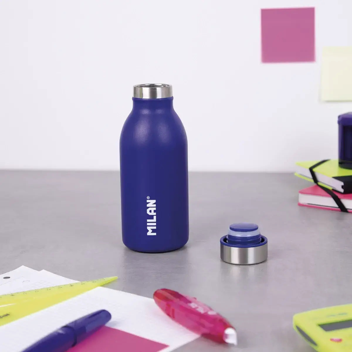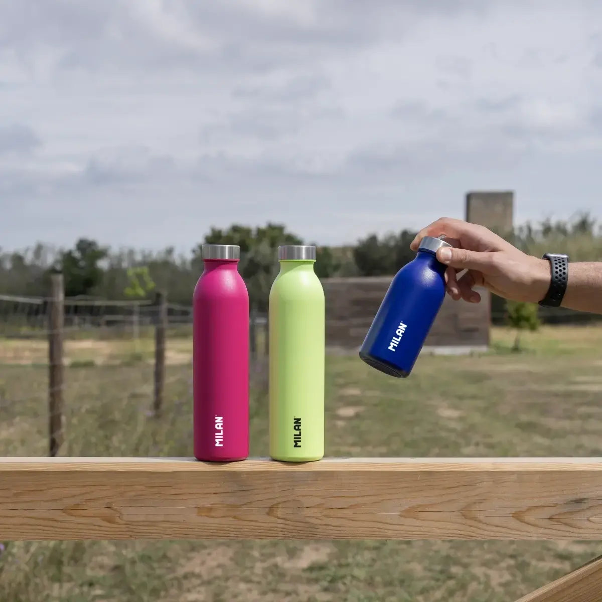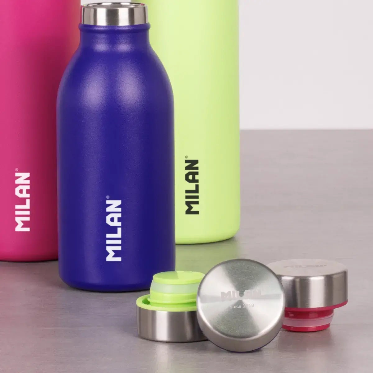 Botella de agua térmica MILAN Acid fabricada en acero inoxidable, con doble pared de vacío que mantiene la temperatura del contenido hasta 12h con líquidos calientes y 24h con líquidos fríos.