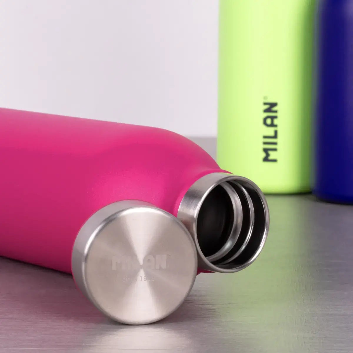 Botella de agua térmica MILAN Acid fabricada en acero inoxidable, con doble pared de vacío que mantiene la temperatura del contenido hasta 12h con líquidos calientes y 24h con líquidos fríos.