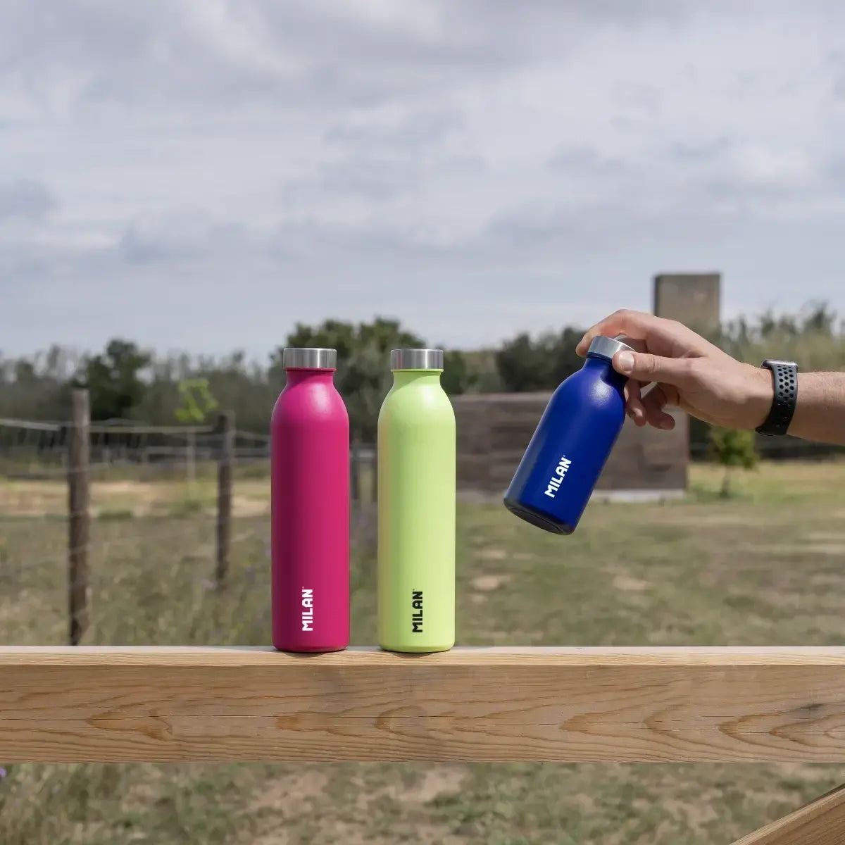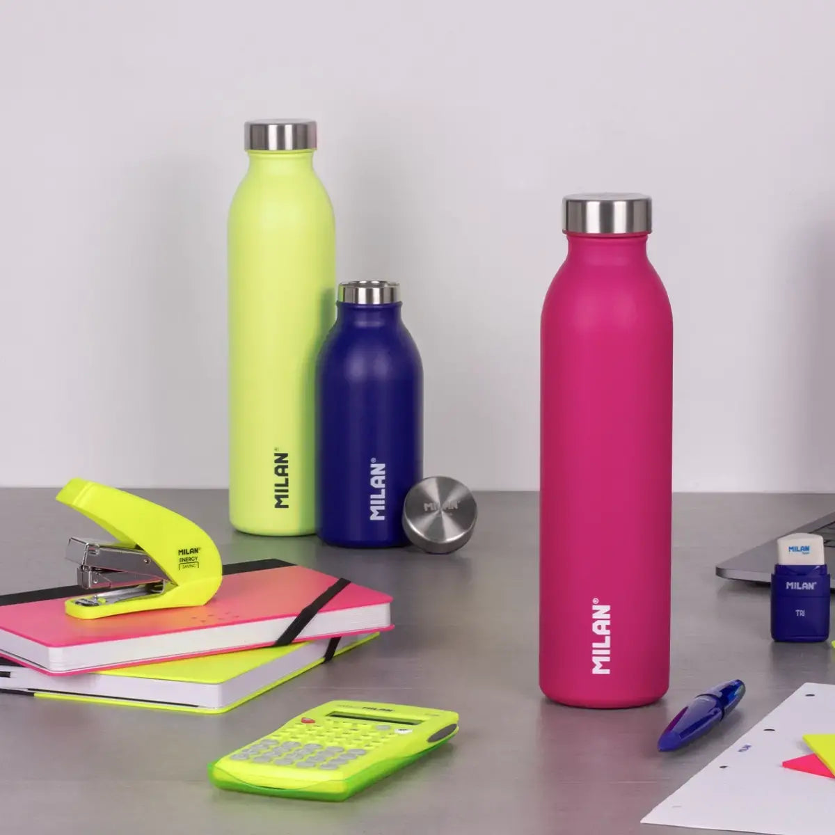 Colección Acid: complementos de escuela y oficina funcionales en colores ácidos y vibrantes. We protect: el uso de botellas reutilizables contribuye a reducir el consumo de botellas de plástico de un solo uso.