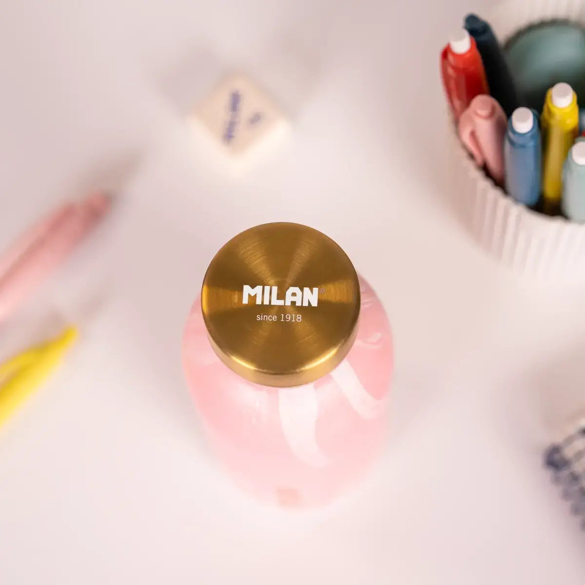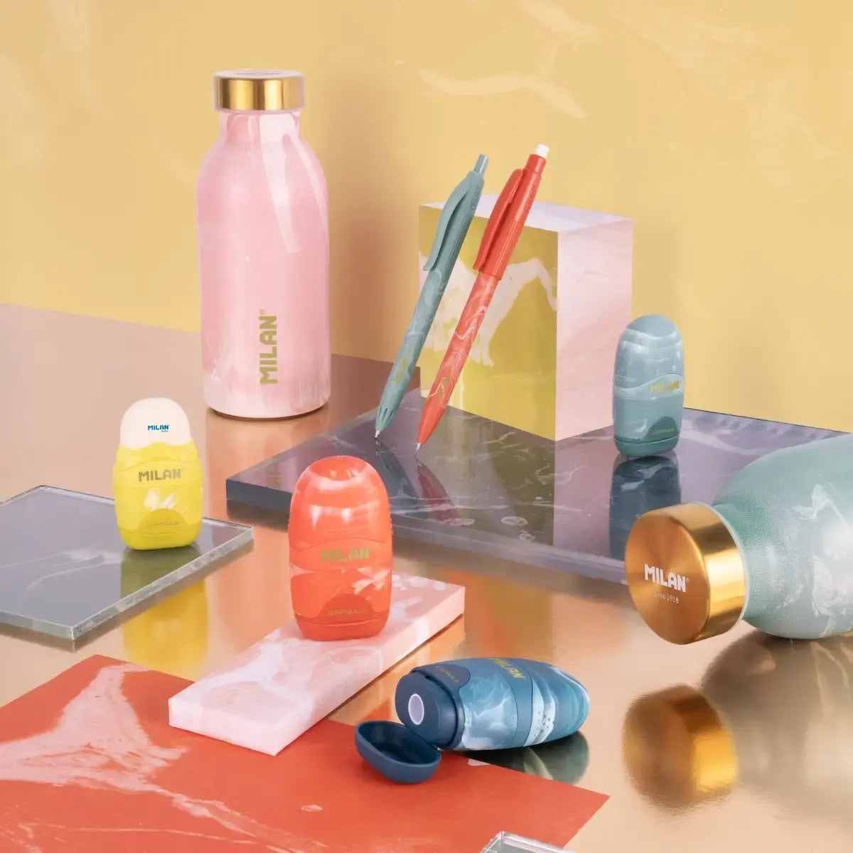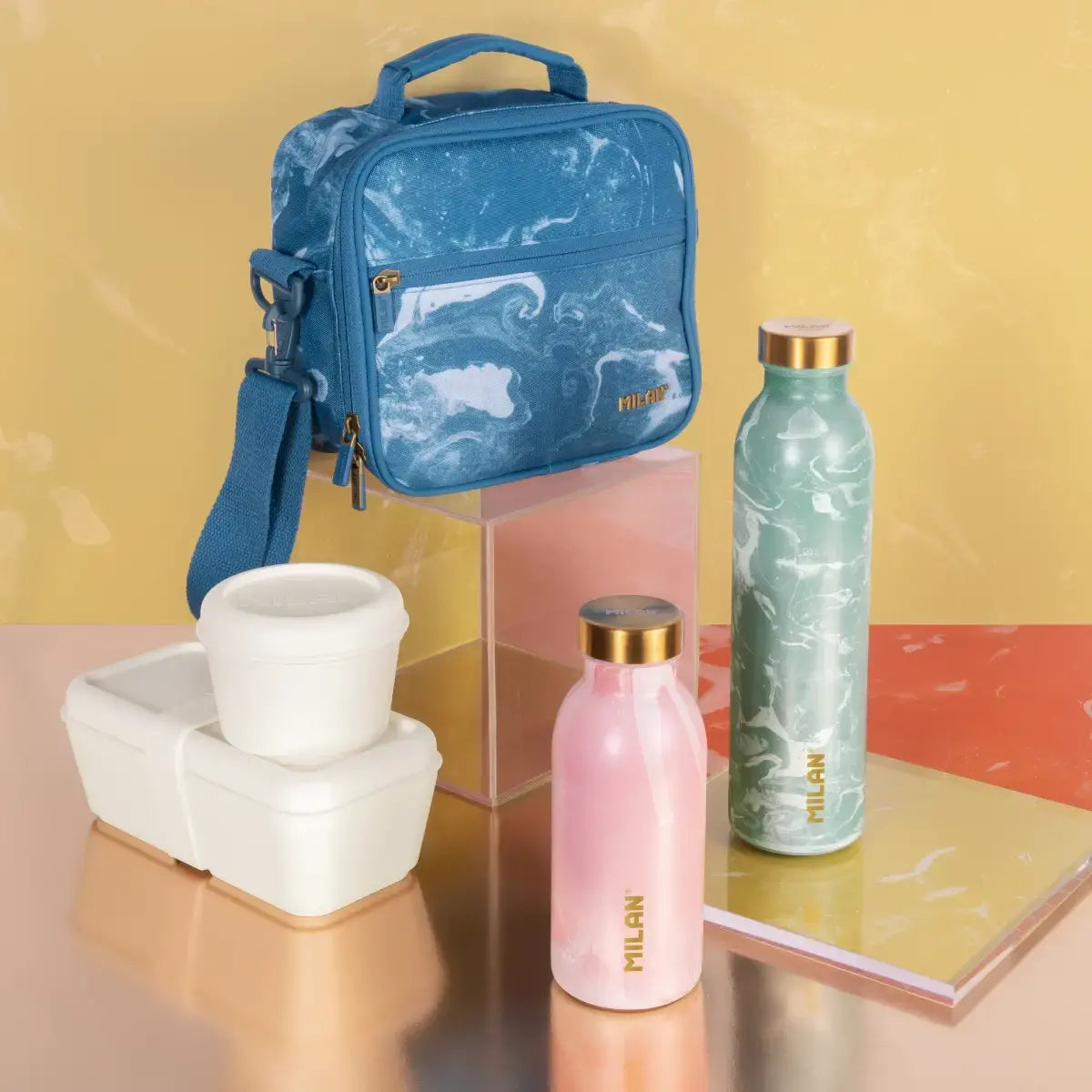 Lava está inspirada en las erupciones volcánicas y en el movimiento de la roca fundida. Los colores evocan los distintos tonos de este fenómeno geológico: azul, amarillo, rojo, verde y rosa, y se combinan con dorados que generan un efecto visual sofisticado. We protect: el uso de botellas reutilizables contribuye a reducir el consumo de botellas de plástico de un solo uso.