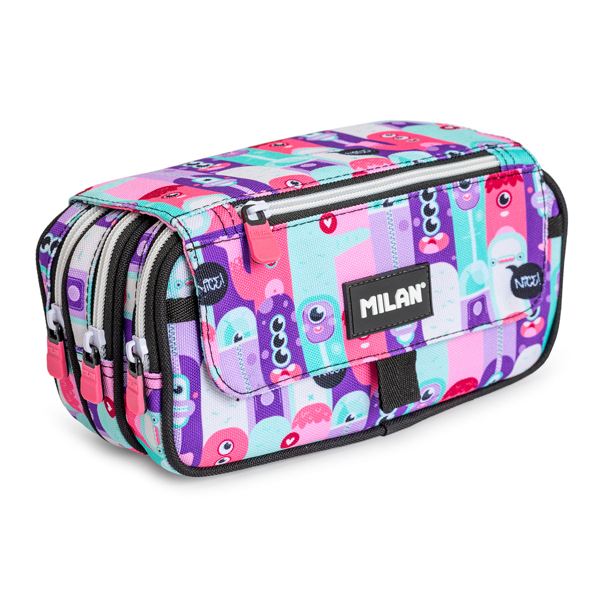 Estuche portatodo triple MILAN Roller 2, de amplios apartados y gran capacidad. Cuenta con 4 cremalleras, 3 principales y otra en la solapa una solapa exterior que incluye tirador de tela y cierre magnético de botón. Cierres de cremallera ancha y resistentes con tiradores metálicos con recubrimiento de goma para mayor confort.