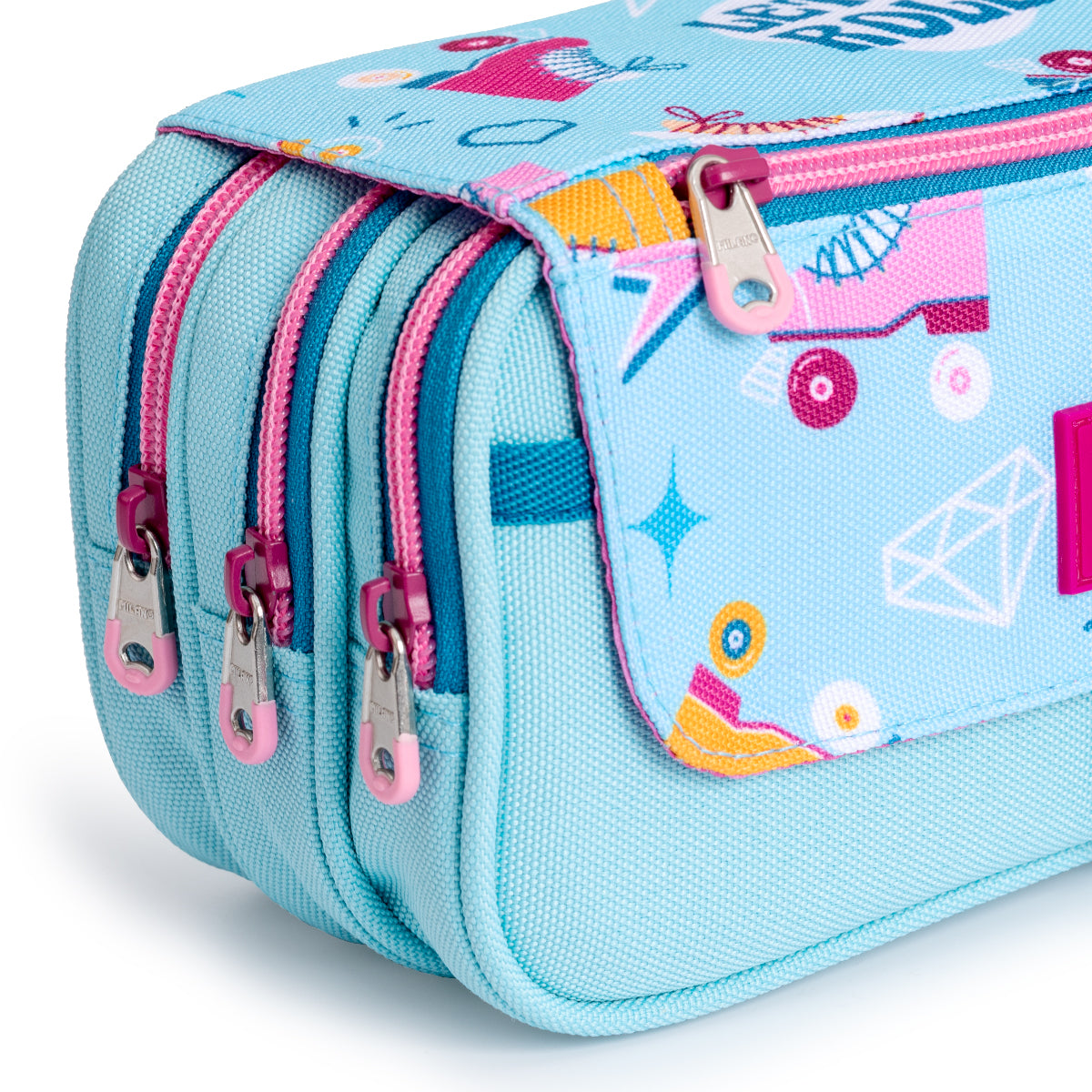 Estuche portatodo triple MILAN Roller 2, de amplios apartados y gran capacidad. Cuenta con 4 cremalleras, 3 principales y otra en la solapa una solapa exterior que incluye tirador de tela y cierre magnético de botón. Cierres de cremallera ancha y resistentes con tiradores metálicos con recubrimiento de goma para mayor confort.