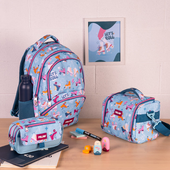 Serie especial Roller 2, una colección con un diseño inspirado en los patines retro de 4 ruedas. Un estampado creado con una paleta de tonalidades azules, mostaza y rosa.