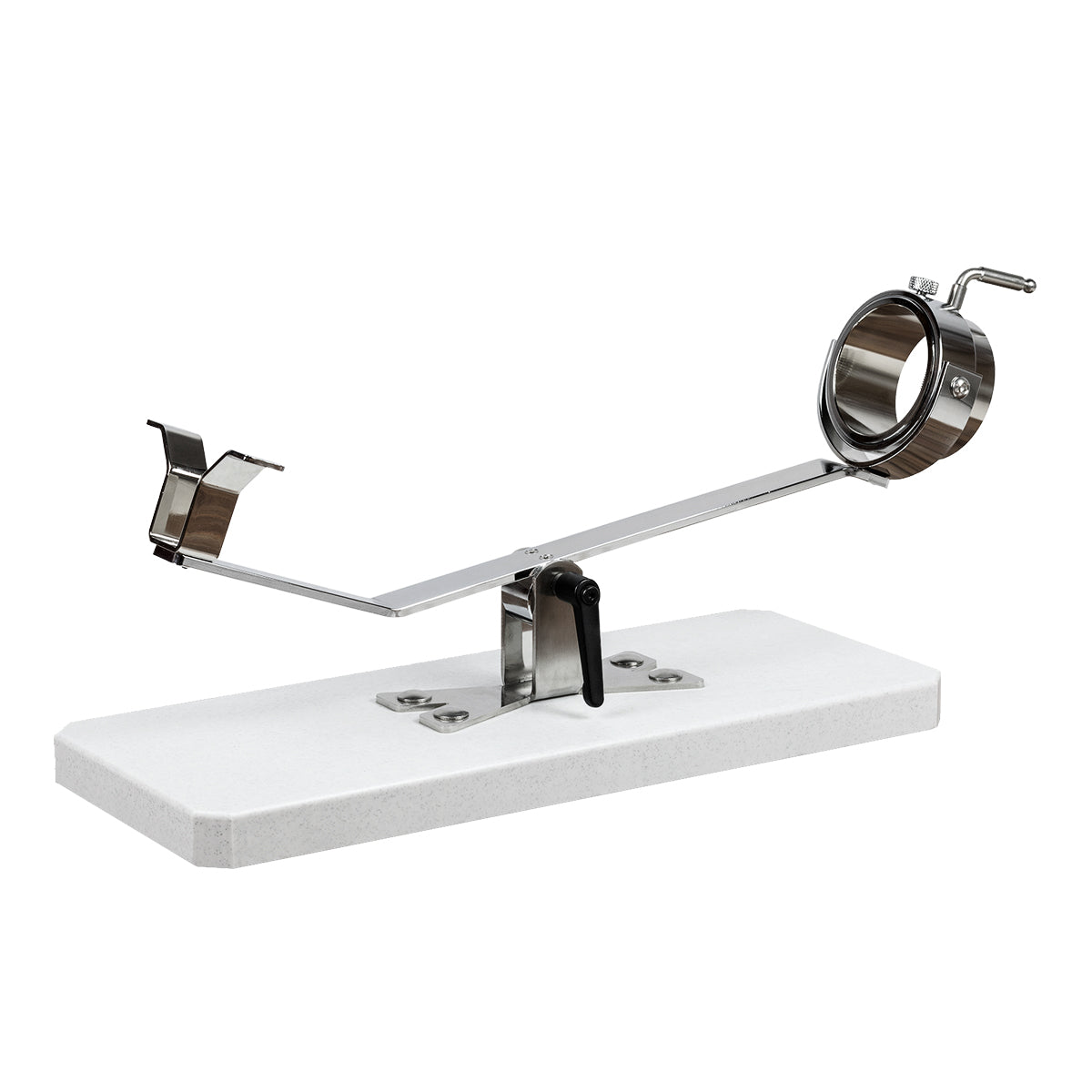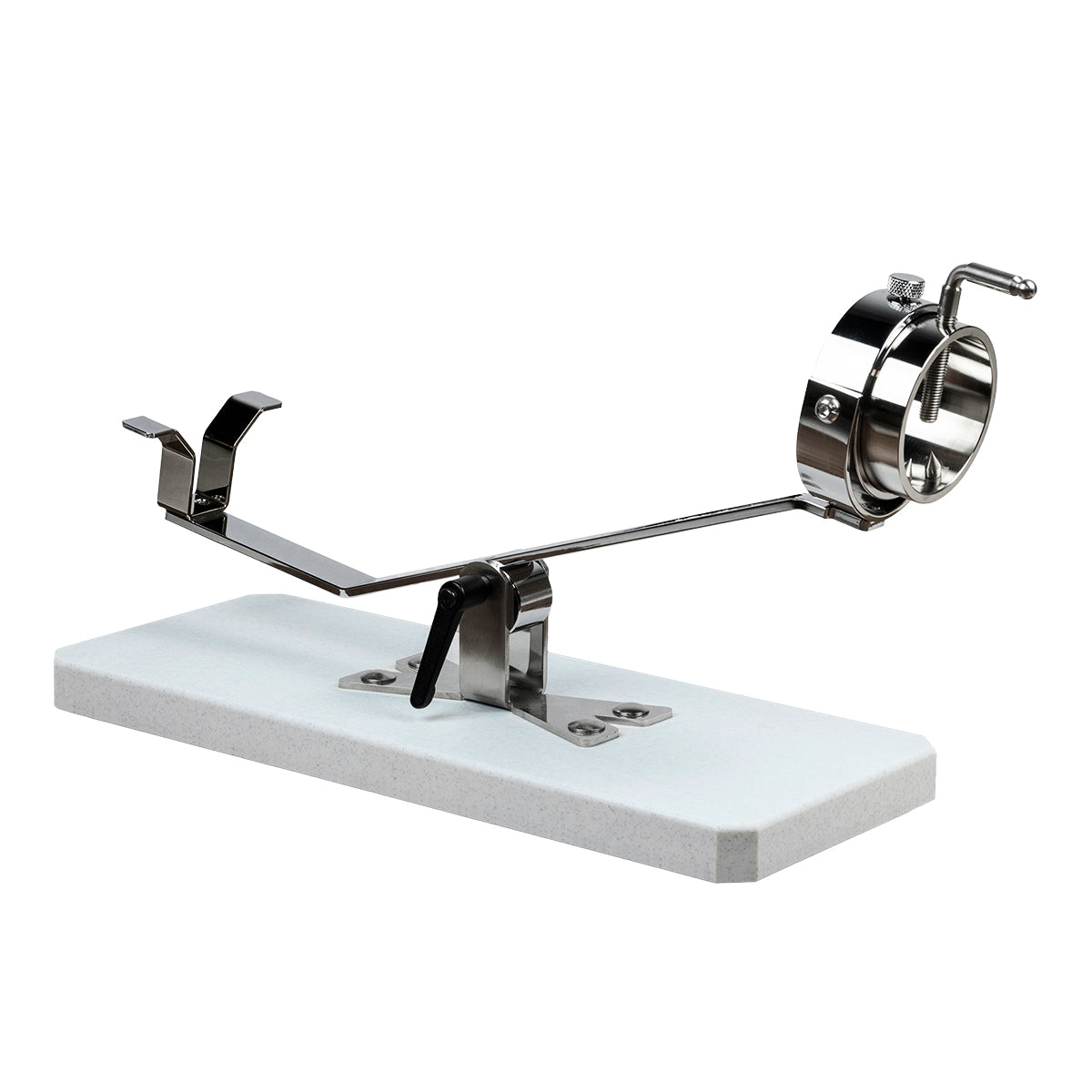 Soporte jamonero basculante con cabezal giratorio modelo Teide con base de fibra. Su forma y diseño facilitan el corte del jamón en cualquier ángulo. Los herrajes son de acero con acabado cromado brillante y los pinchos son de acero inoxidable AISI-304.