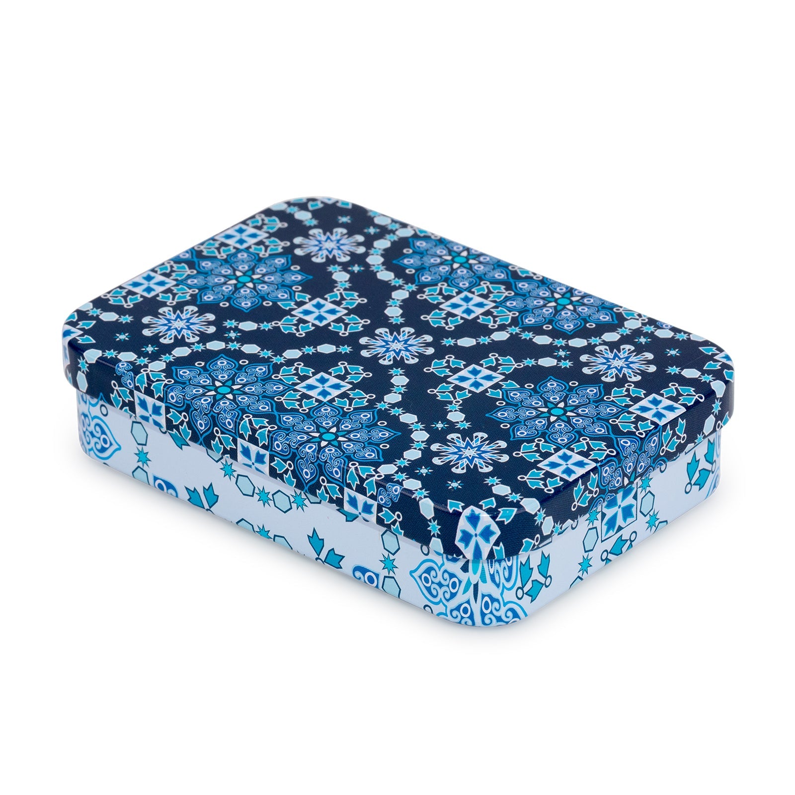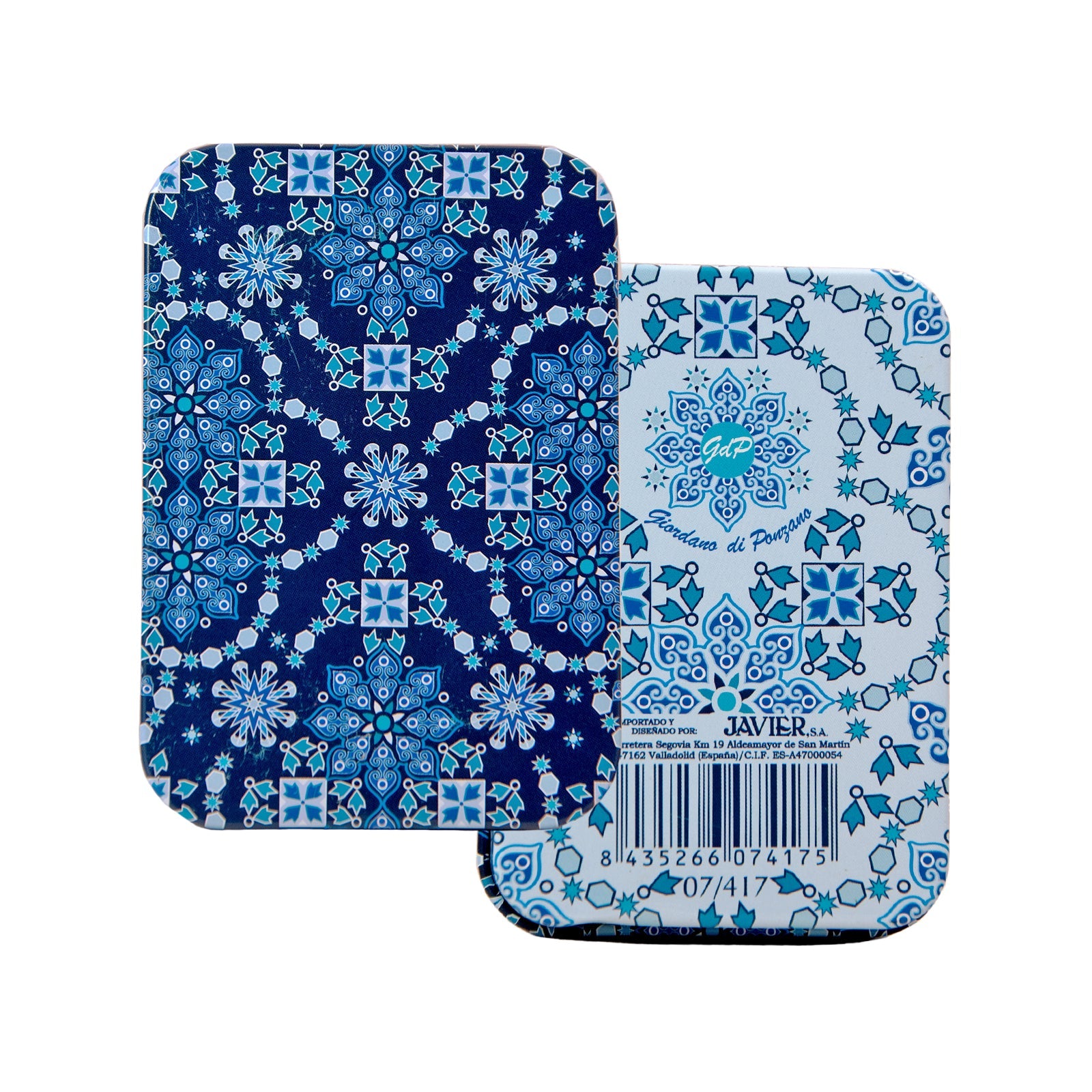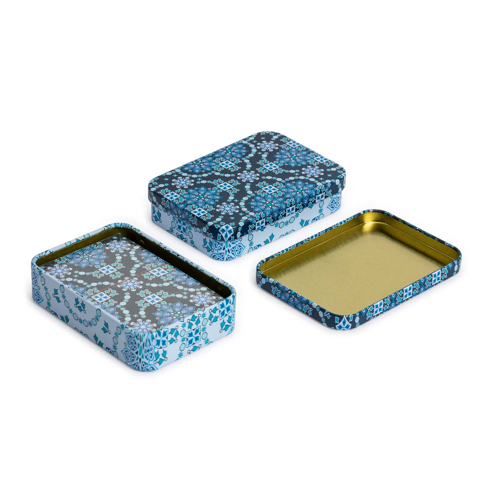Se presentan en un estuche metálico con el mismo dibujo que el reverso de las cartas y cuenta con cierre a presión. Perfecto para que te puedas llevar tu baraja a cualquier lugar de forma segura.