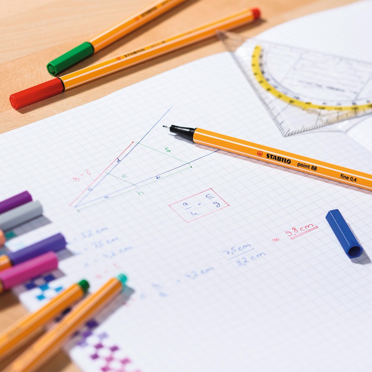 El STABILO point 88 es el rotulador punta fina perfecto para crear notas, con una escritura ordenada, subrayando, creando pequeños bocetos y está disponible en 47 colores. Tiene la punta de fibra con refuerzo metálico y es apto para su uso con reglas y plantillas. No se seca si se deja sin tapón durante largos periodos. Tapón ventilado. Ancho de trazo: 0.4 mm.