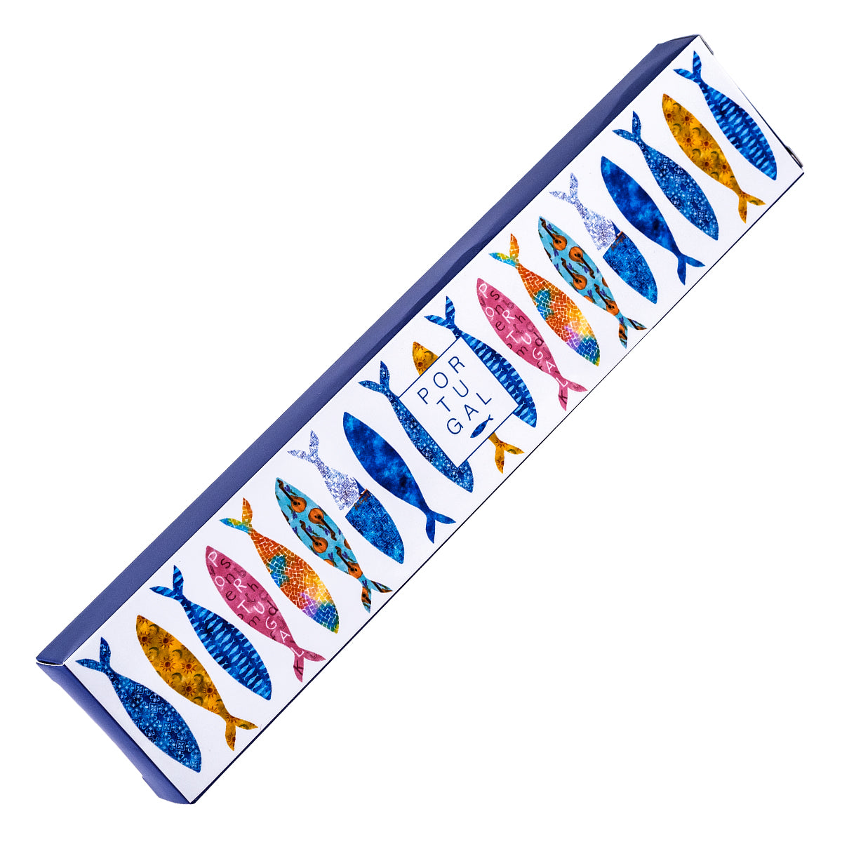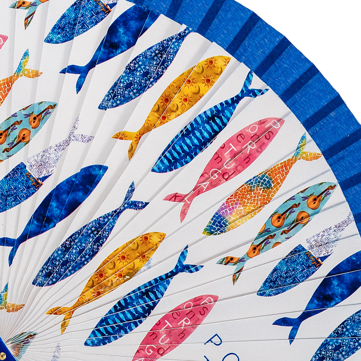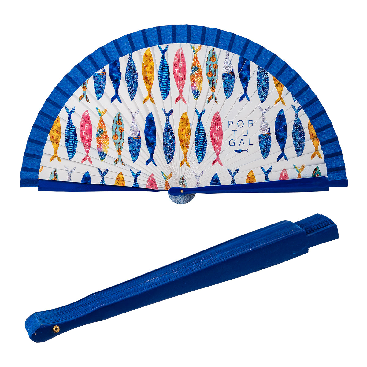 Abanico plegable de la colección Sardinas de Javier. Está fabricado con varillas de madera estampada y tela. El abanico viene presentado en un estuche de cartón con el mismo diseño, ¡perfecto para regalar!