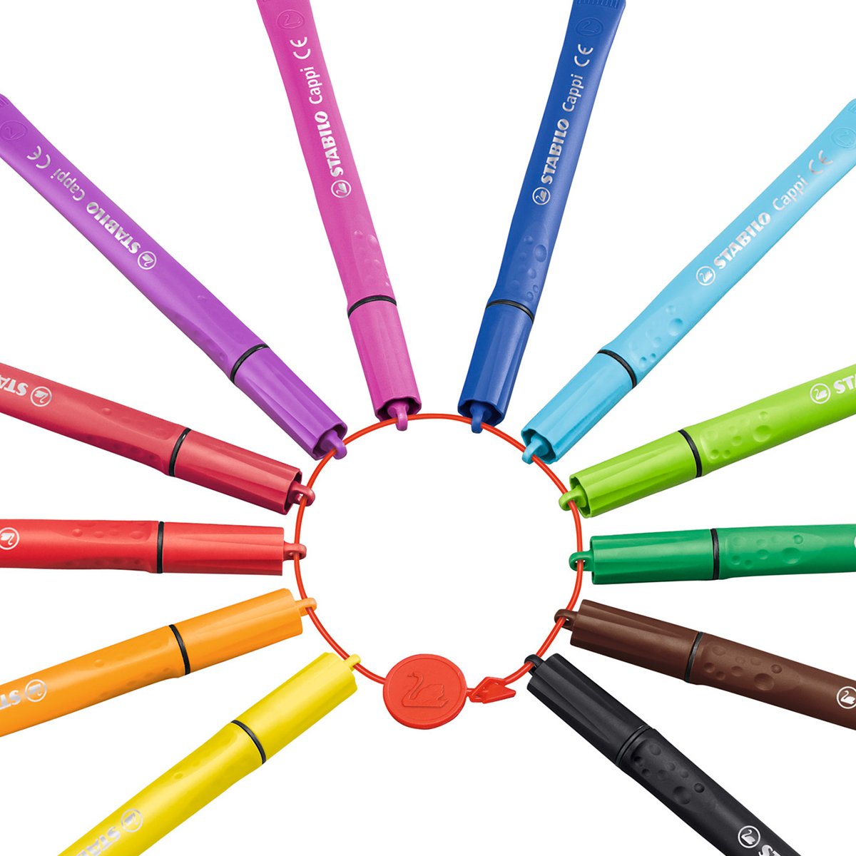 Estuche de 12 rotuladores ergonómicos edición Cappi, con tinta lavable en colores vibrantes que permiten crear multitud de imágenes en la escuela o en casa. Están diseñados con un agarre ergonómico y una punta media robusta (con un ancho de línea de aproximadamente 1 mm), permiten horas de diversión creativa sin ningún tipo de esfuerzo en las manos.