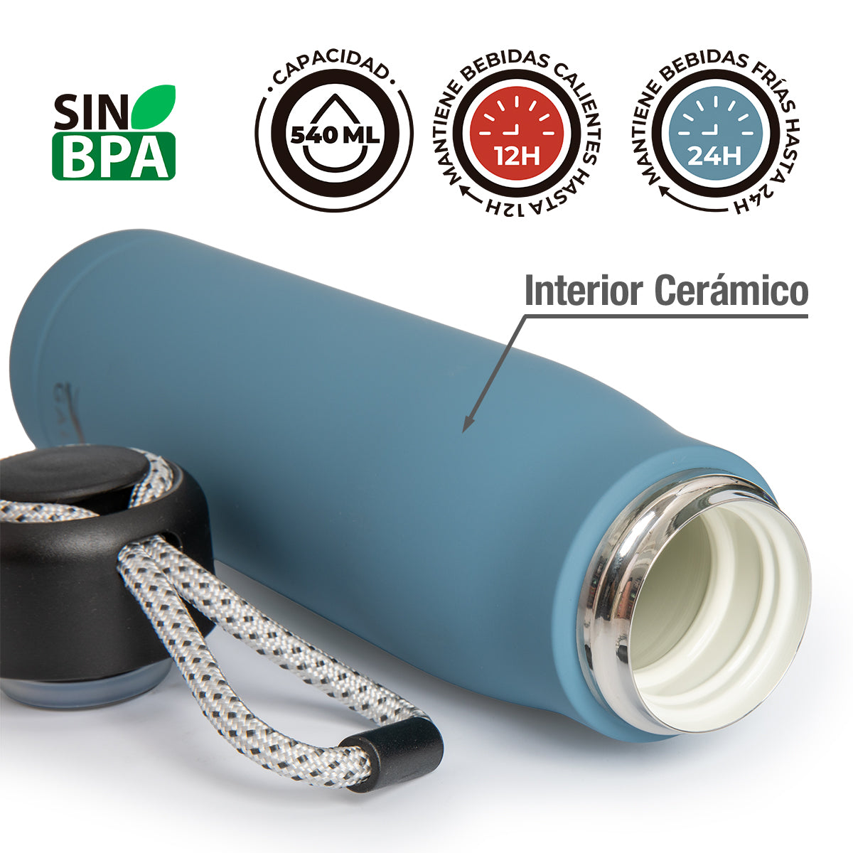 Es una botella moderna que asegura temperatura, sabor y sostenibilidad. El recubrimiento cerámico de alta tecnología permite mantener tu bebida durante largas horas sin exponerla al metal, evitando además desagradables transferencias de sabor. Totalmente libre de BPA.