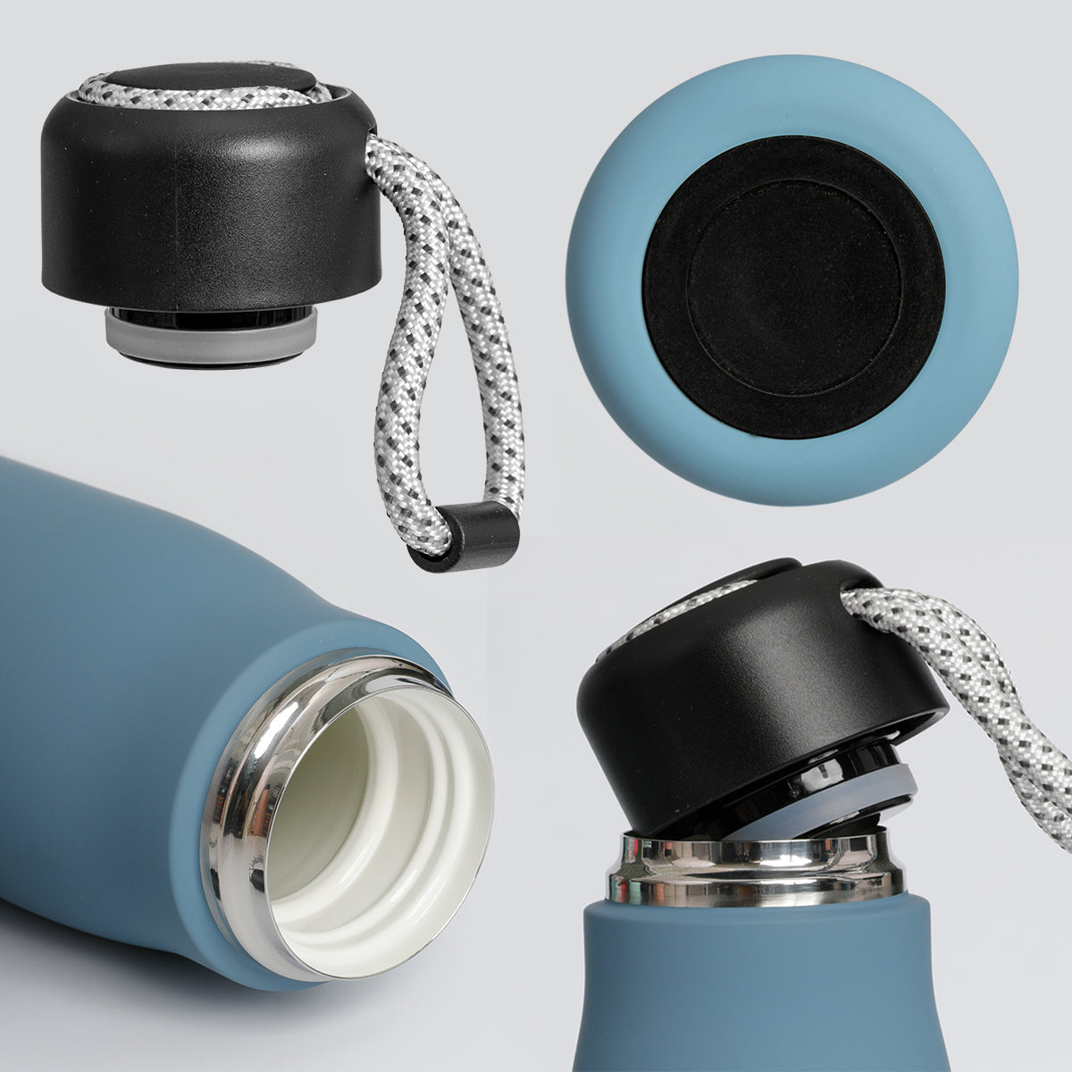 Su acabado exterior engomado de tacto suave es muy agradable de coger, no resbala y además es resistente a los arañazos. Cuenta con una base de silicona que protege las superficies y asegura que la botella no se deslice. Su práctica asa te permitirá llevarla a cualquier lugar cómodamente. Superficie exterior libre de condensación. Presentación en caja de de cartón reciclado ideal para regalar.