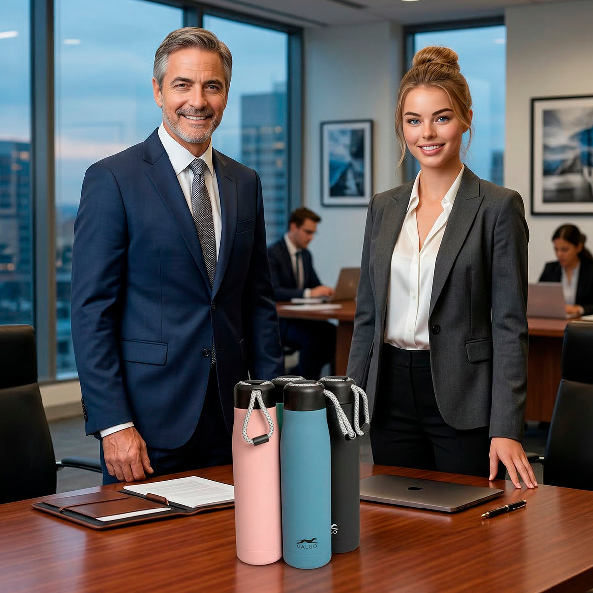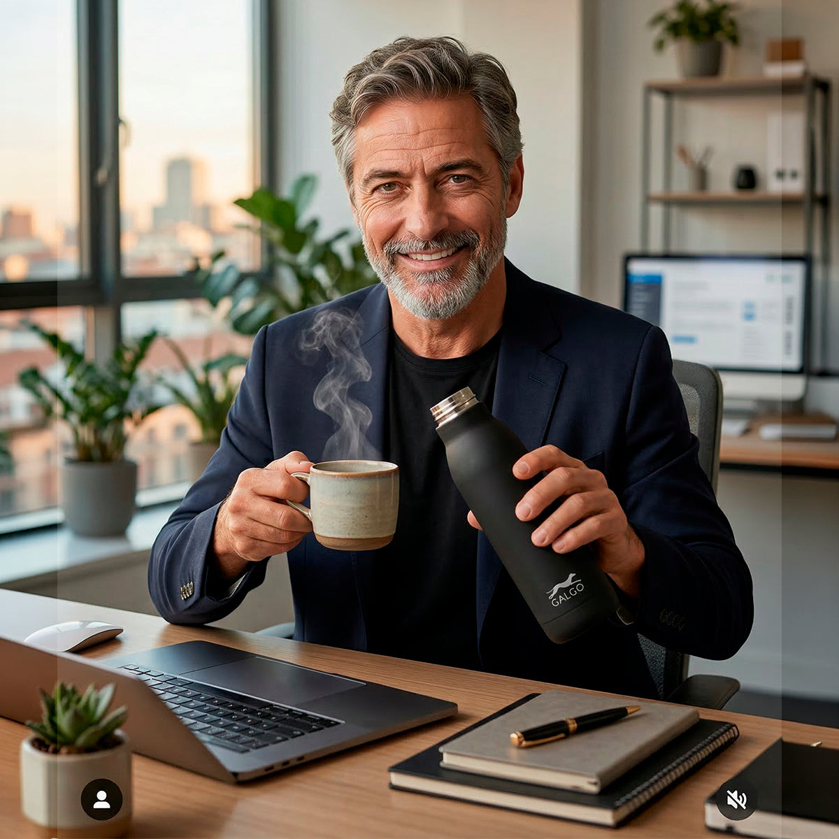 Botella térmica reutilizable Galgo Corporate de 540 ml fabricada en acero inoxidable de grado alimentario AISI 304 con doble capa de recubrimiento cerámico y tapón roscado con junta de silicona y con un practico cordón para su transporte. Mantiene tus bebidas frías durante 24 horas y calientes durante 12 horas. Ideal para proteger el medio ambiente en tu día a día evitando los envases de un solo uso.