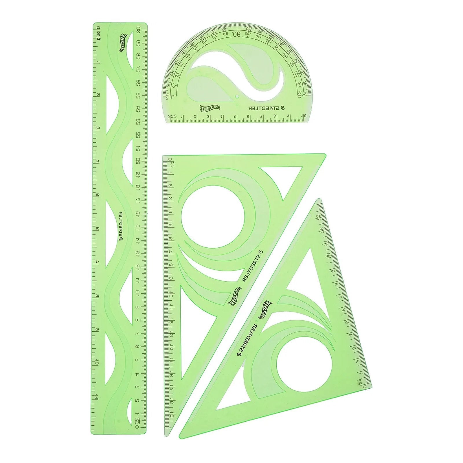 Conjunto para dibujo técnico que contiene una regla de 30 cm, una escuadra de 21 cm, un cartabón de 21 cm y un transportador de ángulos de 10 cm Staedtler, presentado en una bolsa de plástico transparente.