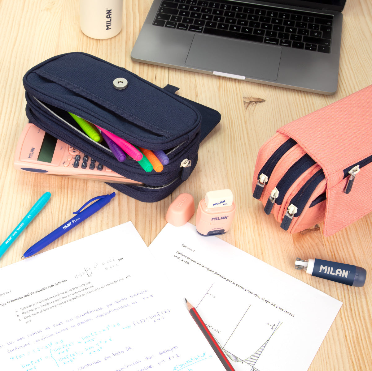 Estuche portatodo triple MILAN 1918, de amplios apartados y gran capacidad. Cuenta con 4 cremalleras, 3 principales y otra en la solapa una solapa exterior que incluye tirador de tela y cierre magnético de botón. Cierres de cremallera ancha y resistentes con tiradores metálicos con recubrimiento de goma para mayor confort.