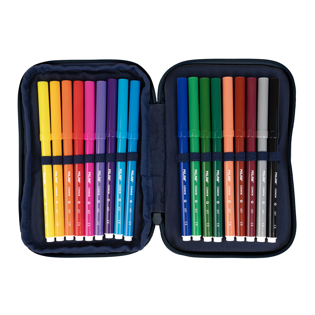 Contenido: 2 gomas de borrar (4024 y Nata blue), 1 sacapuntas AFILA, 1 lápiz de grafito HB, 1 bolígrafo P1 touch azul, 1 regla triangular de 15 cm, 12 lápices de colores triangulares, 18 rotuladores de punta cónica.