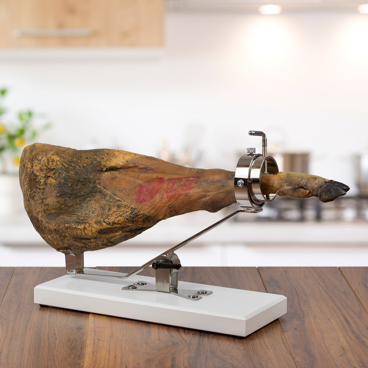 Soporte jamonero basculante con cabezal giratorio modelo Aneto fabricado en base de madera DM lacada en blanco y acero inoxidable. Su forma y diseño facilitan el corte del jamón en cualquier ángulo. Los herrajes son de acero con acabado cromado brillante y los pinchos son de acero inoxidable AISI-304. Las piezas estan unidas con tornilleria Torx.