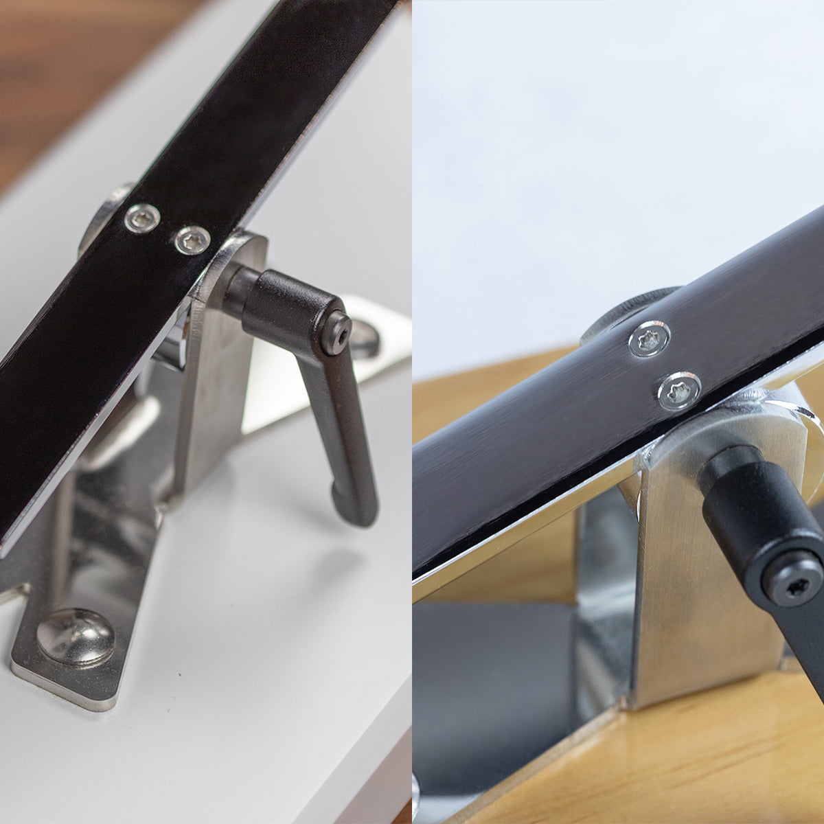Su sistema de casquillos giratorios permiten girar el jamón los grados que se desee sin necesidad de soltar la pata. La sujeción de la punta tiene forma de V y no lleva pincho para evitar perforar el jamón y/o dañarlo. Es un jamonero muy versátil, manejable y cómodo de usar y limpiar.