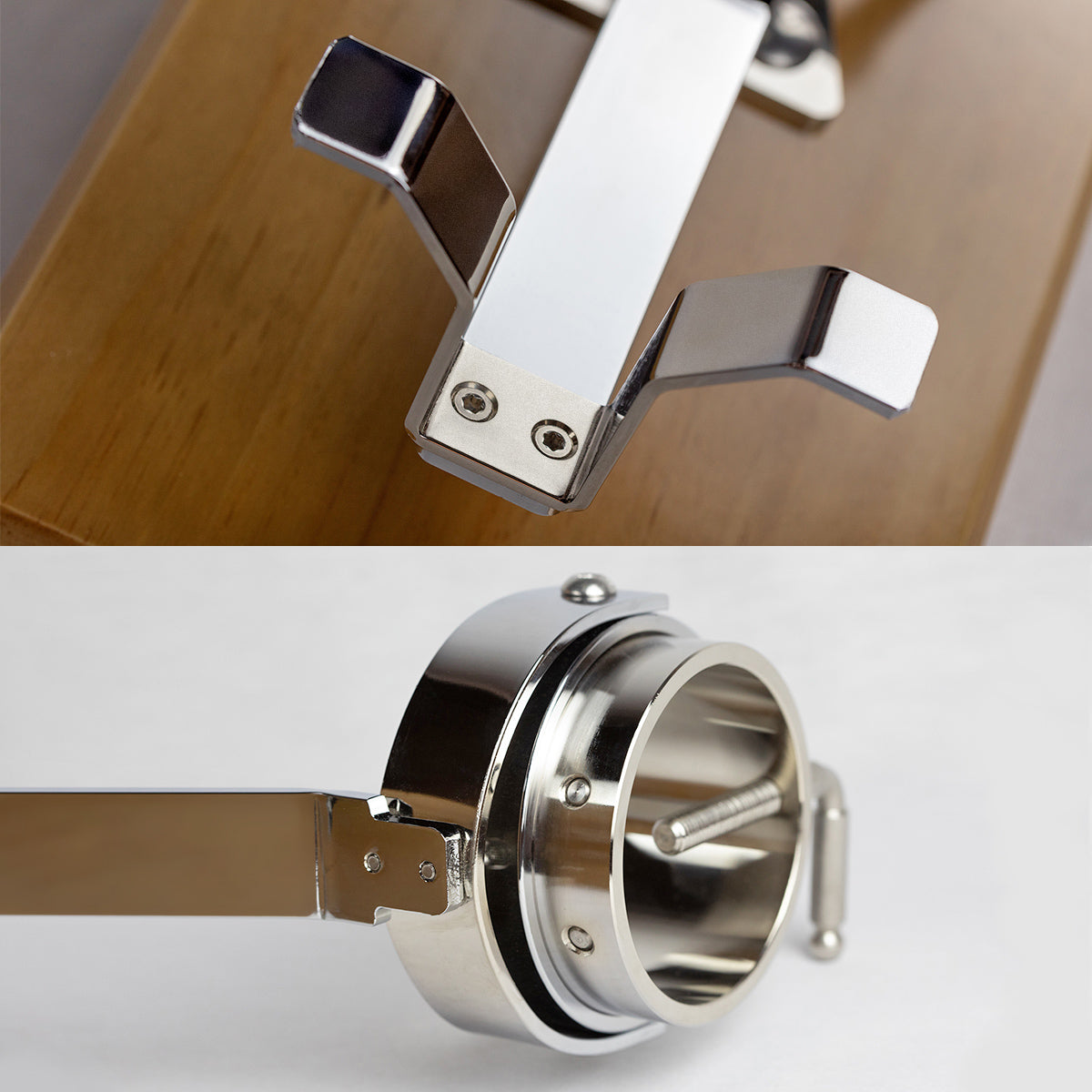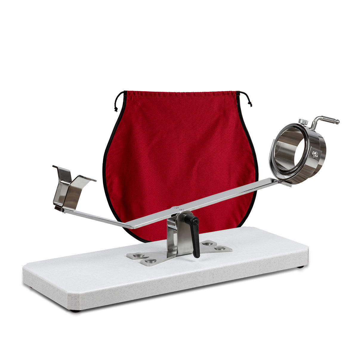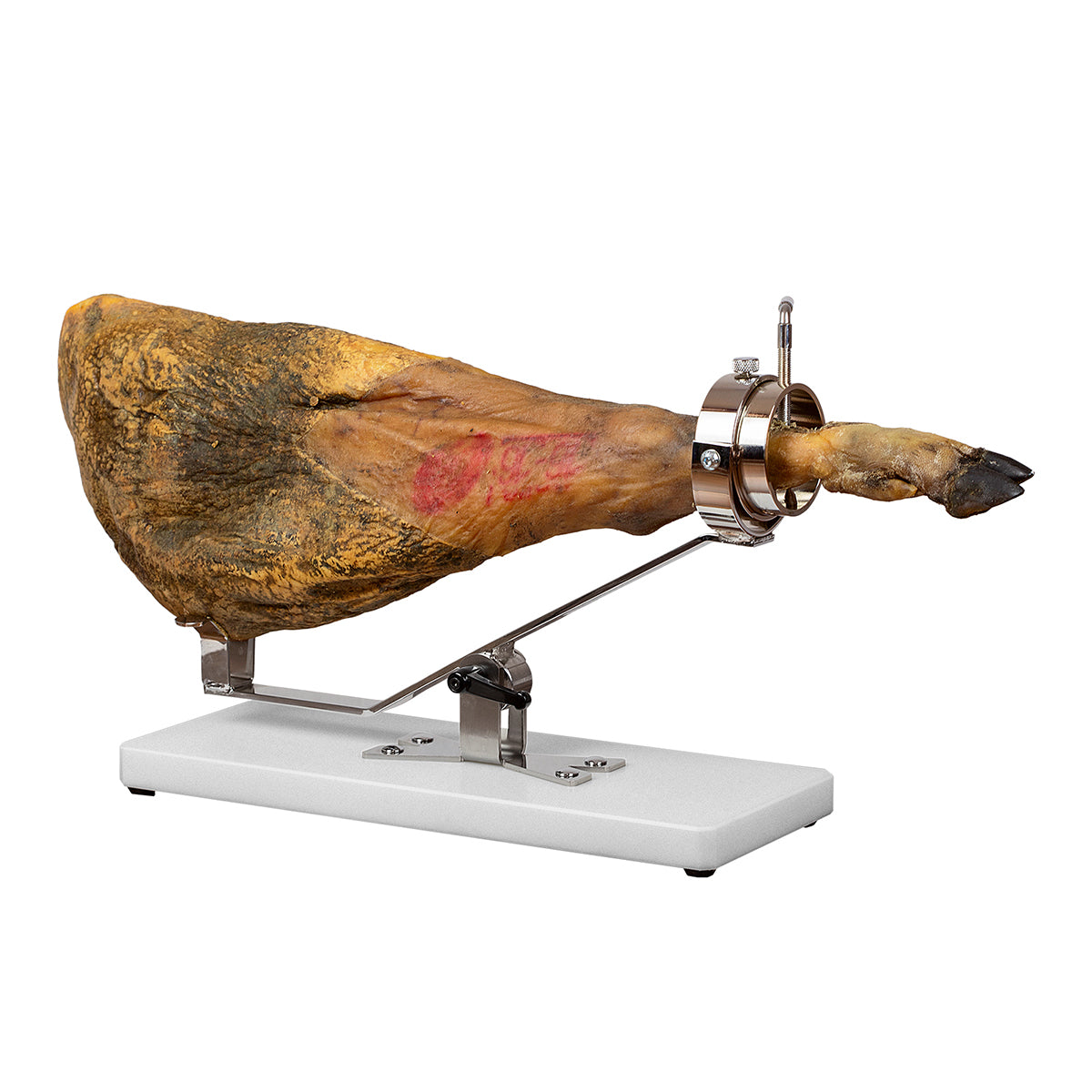 Su sistema de casquillos giratorios permiten girar el jamón los grados que se desee sin necesidad de soltar la pata. La sujeción de la punta tiene forma de V y no lleva pincho para evitar perforar el jamón y/o dañarlo. Es un jamonero muy versátil, manejable y cómodo de usar y limpiar.