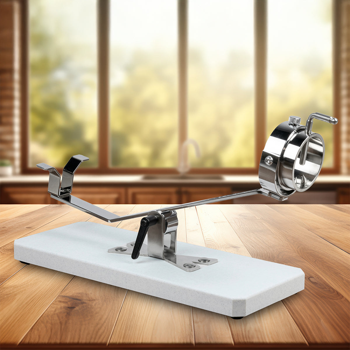 Soporte jamonero basculante con cabezal giratorio modelo Teide fabricado con base de fibra de polietileno en granito y acero inoxidable. Su forma y diseño facilitan el corte del jamón en cualquier ángulo. Los herrajes son de acero con acabado cromado brillante y los pinchos son de acero inoxidable AISI-304. Las piezas estan unidas con tornilleria Torx.
