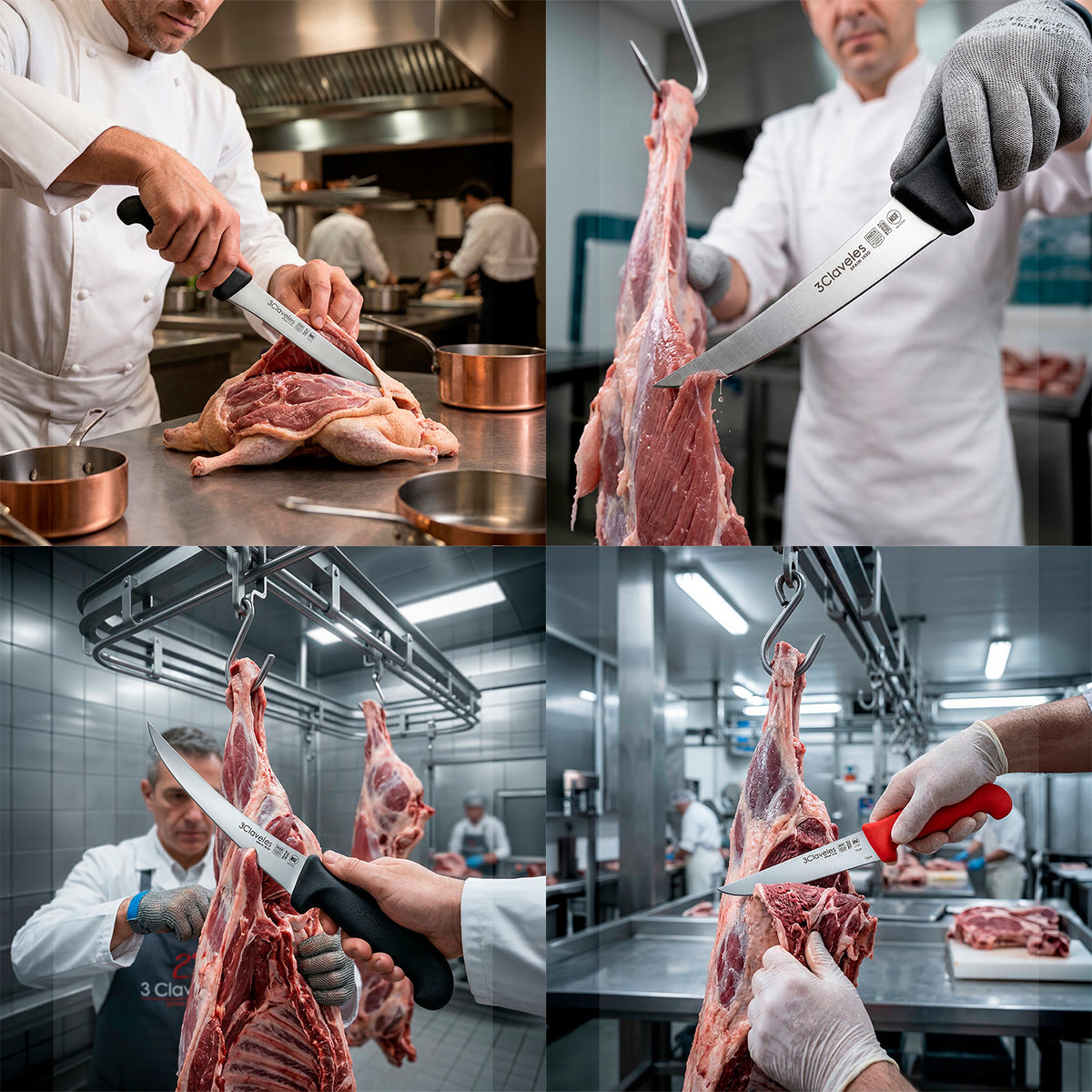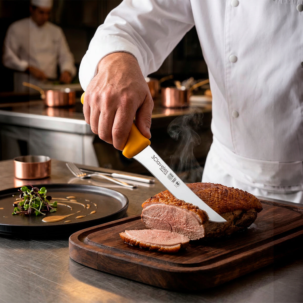 Cuchillo profesional 3 Claveles Proflex Max de hoja de Acero Inoxidable Molibdeno Vanadio. Su diseño exclusivo de mango ha sido cuidadosamente desarrollado para adaptarse a la forma de la mano, ofreciendo un agarre firme y cómodo que reduce la fatiga incluso durante cortes prolongados y reducir al máxima las sobrecargas en las articulaciones del usuario.