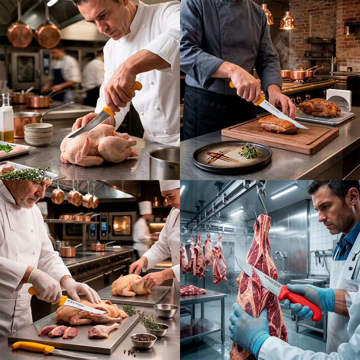 Los cuchillos deshuesadores cuentan con una hoja delgada y de borde suave para limpiar carne. Su afilada hoja está hecha de acero inoxidable resistente a la corrosión y permite hacer cortes precisos rápidamente.