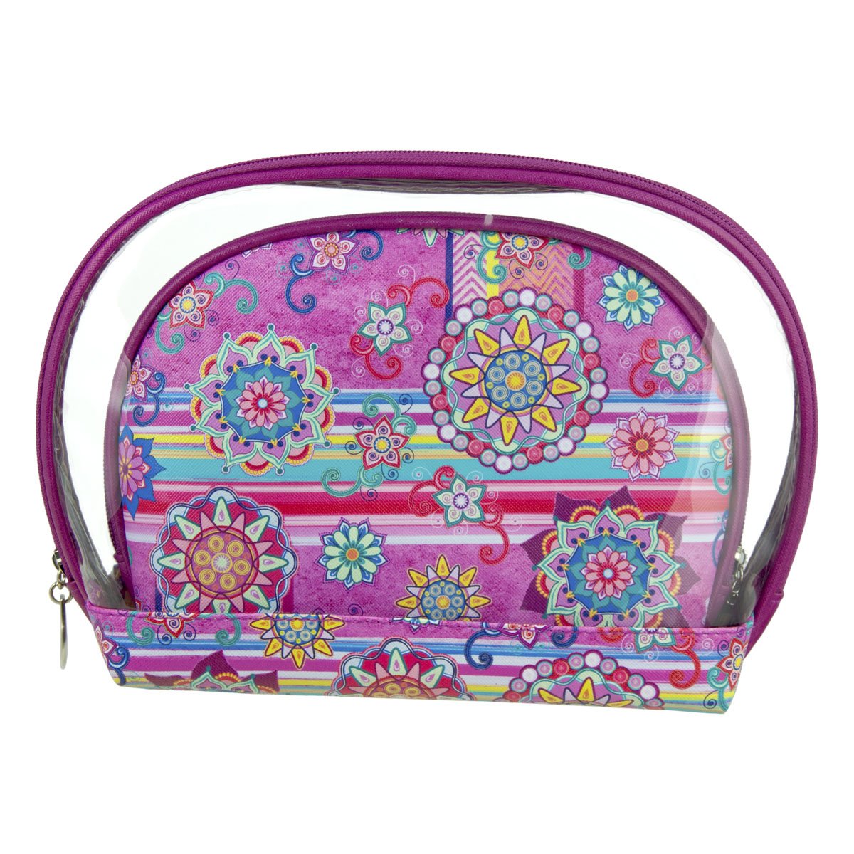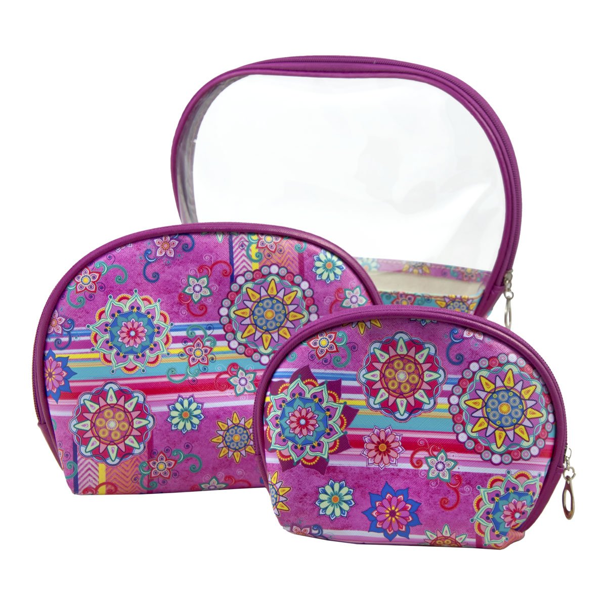 Set de 3 neceseres ovalados de distintos tamaños con cierre de cremallera de alta calidad y diseño modernista decorado con motivos coloridos de diferentes mandalas. Sus medidas permiten guardar uno dentro del otro para que ocupen menos espacio al guardarlos.