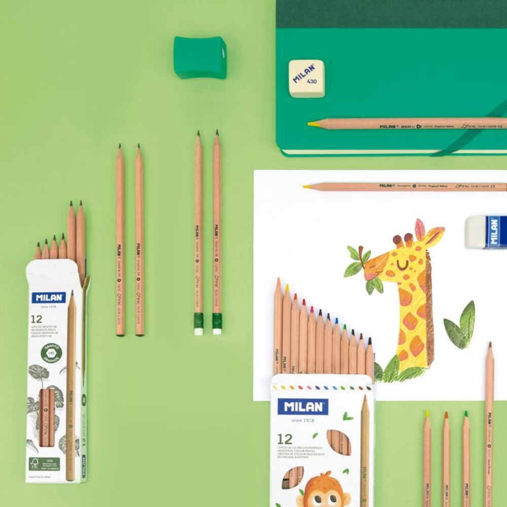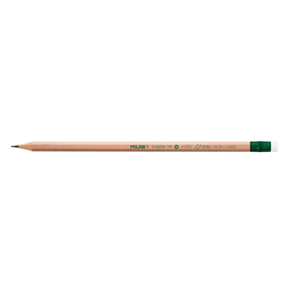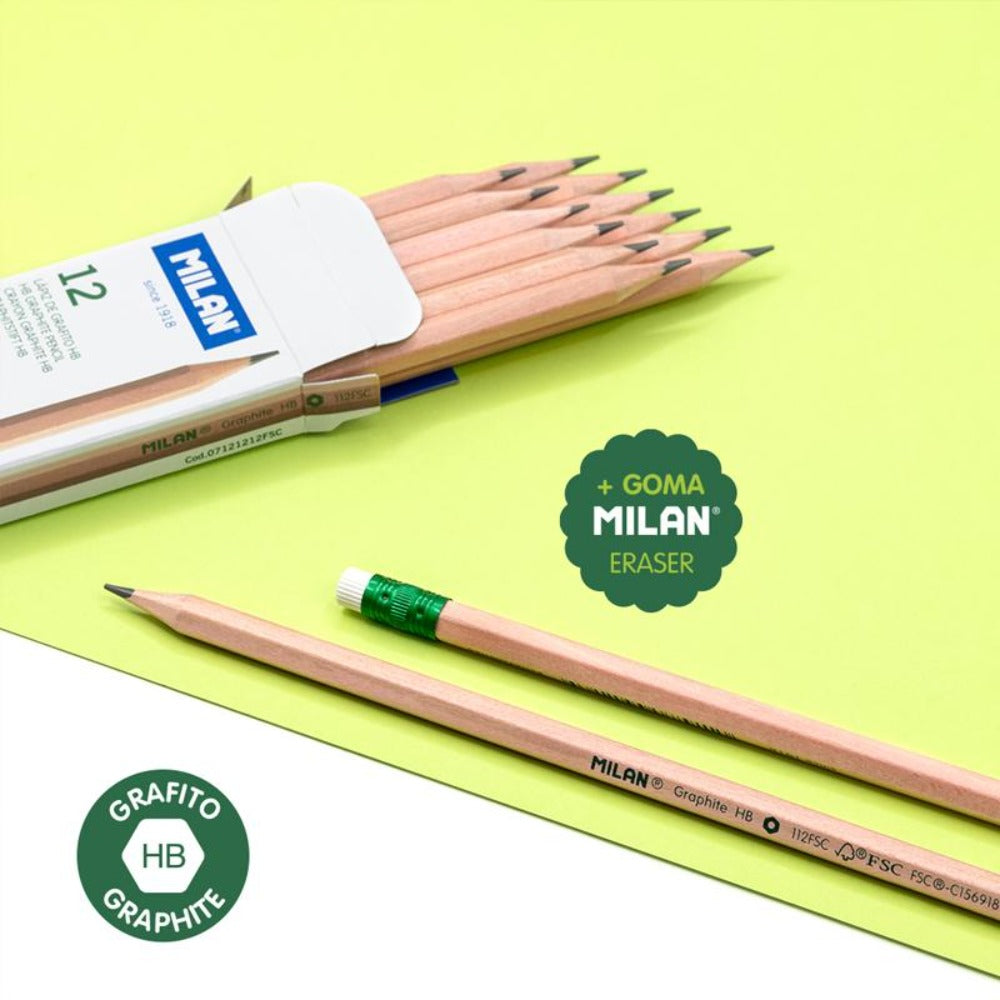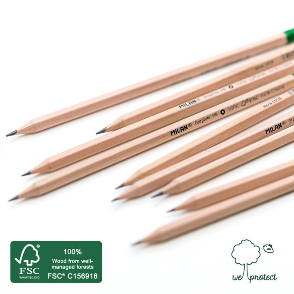 Lápices de grafito HB con goma. Mina de Ø 2.2 mm. Forma hexagonal. La graduación HB es una dureza de grafito media, recomendada para escritura y dibujo. La mina ofrece un trazo uniforme y es resistente a la rotura, gracias al sistema LPS (Lead ProtectiSystem) que protege la mina gracias a su adhesión con la madera. Madera procedente de plantaciones sostenibles, 100% certificada FSC® (Forest Stewardship Council). Referencia: 071212112FSC