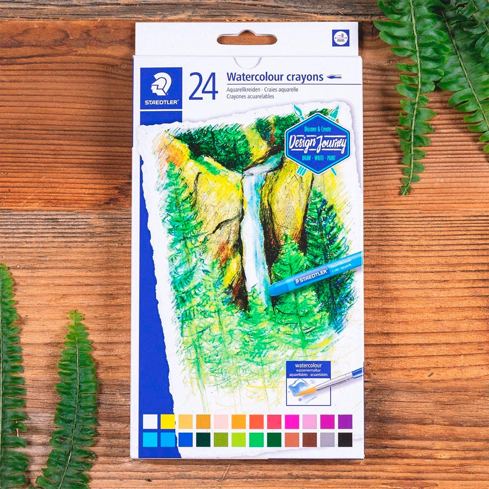 Caja de 24 lápices de cera acuarelables de la serie Design Journey de STAEDTLER, óptimos para dibujar, pintar y esbozar tus creaciones y, en especial, para crear sombreados y otros efectos artísticos y de dibujo. Referencia: 223 C24