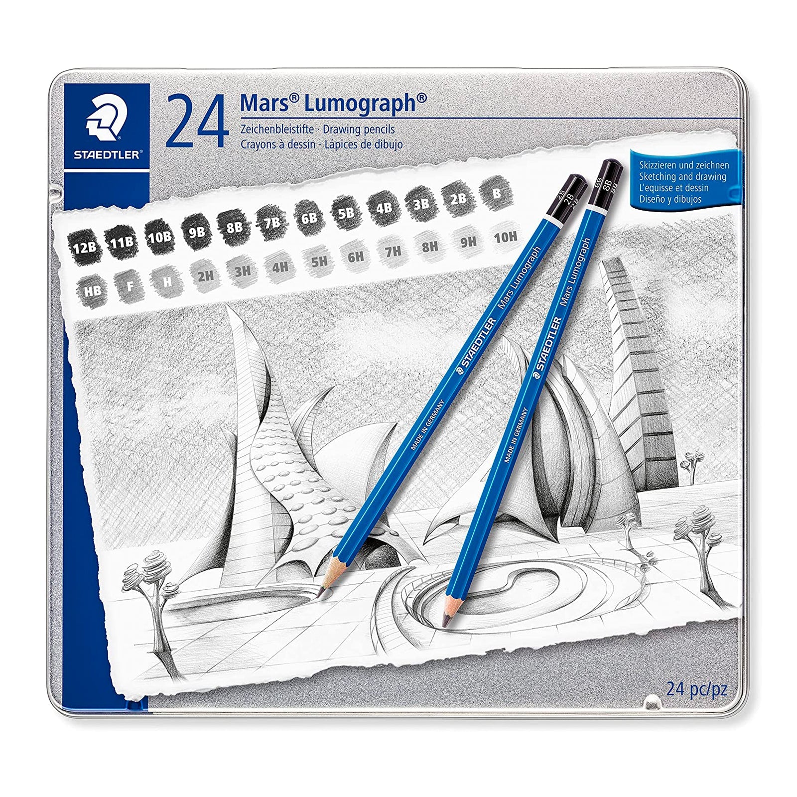 Estuche metálico con 24 lápices de dibujo de calidad premium Mars Lumograph de STAEDTLER de distintas durezas. Son ideales para escribir, dibujar y esbozar sobre papel y papel vegetal. Minas de 2 mm de diámetro. Referencia: 100 G24