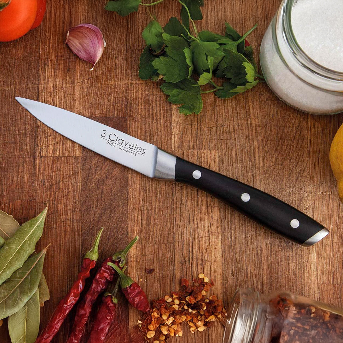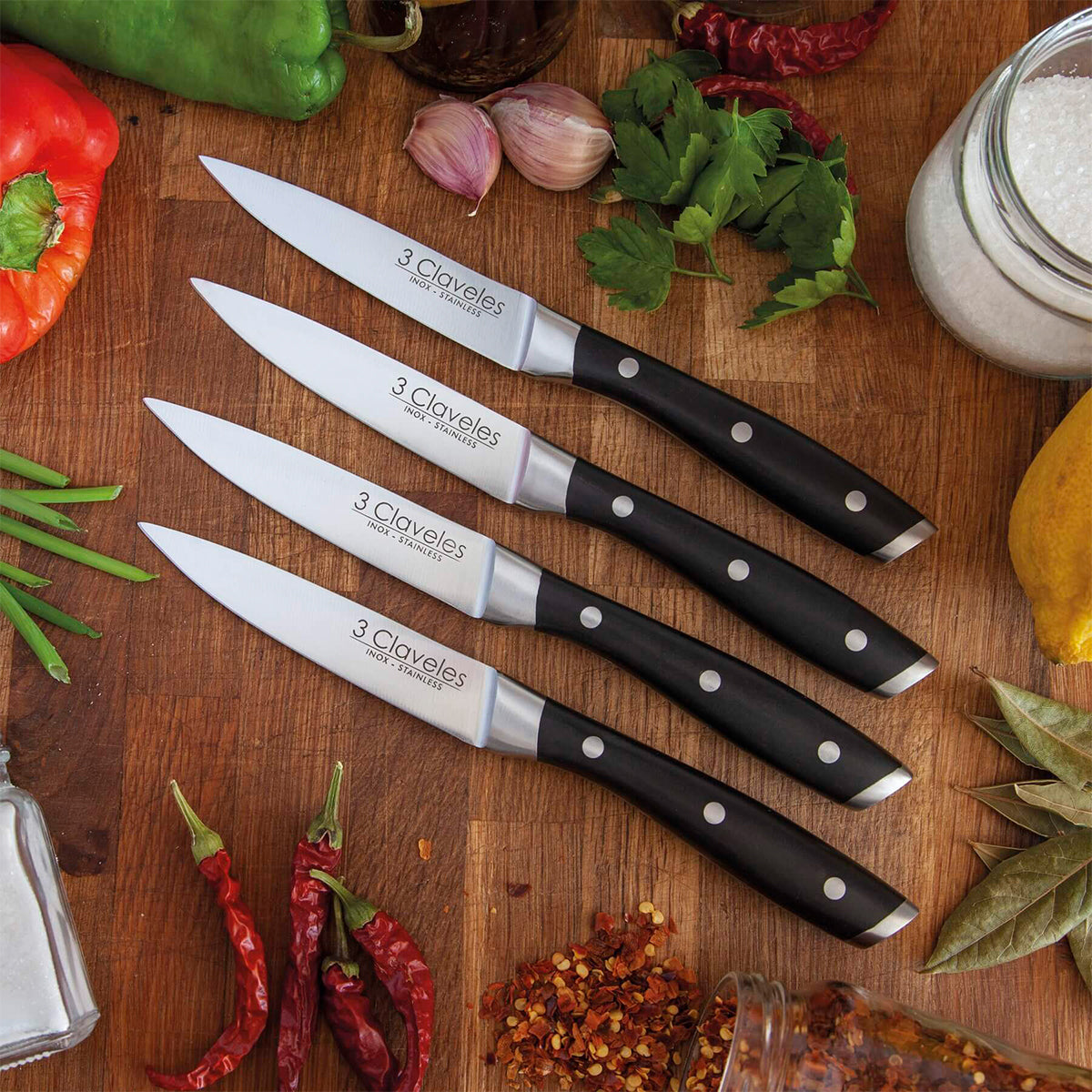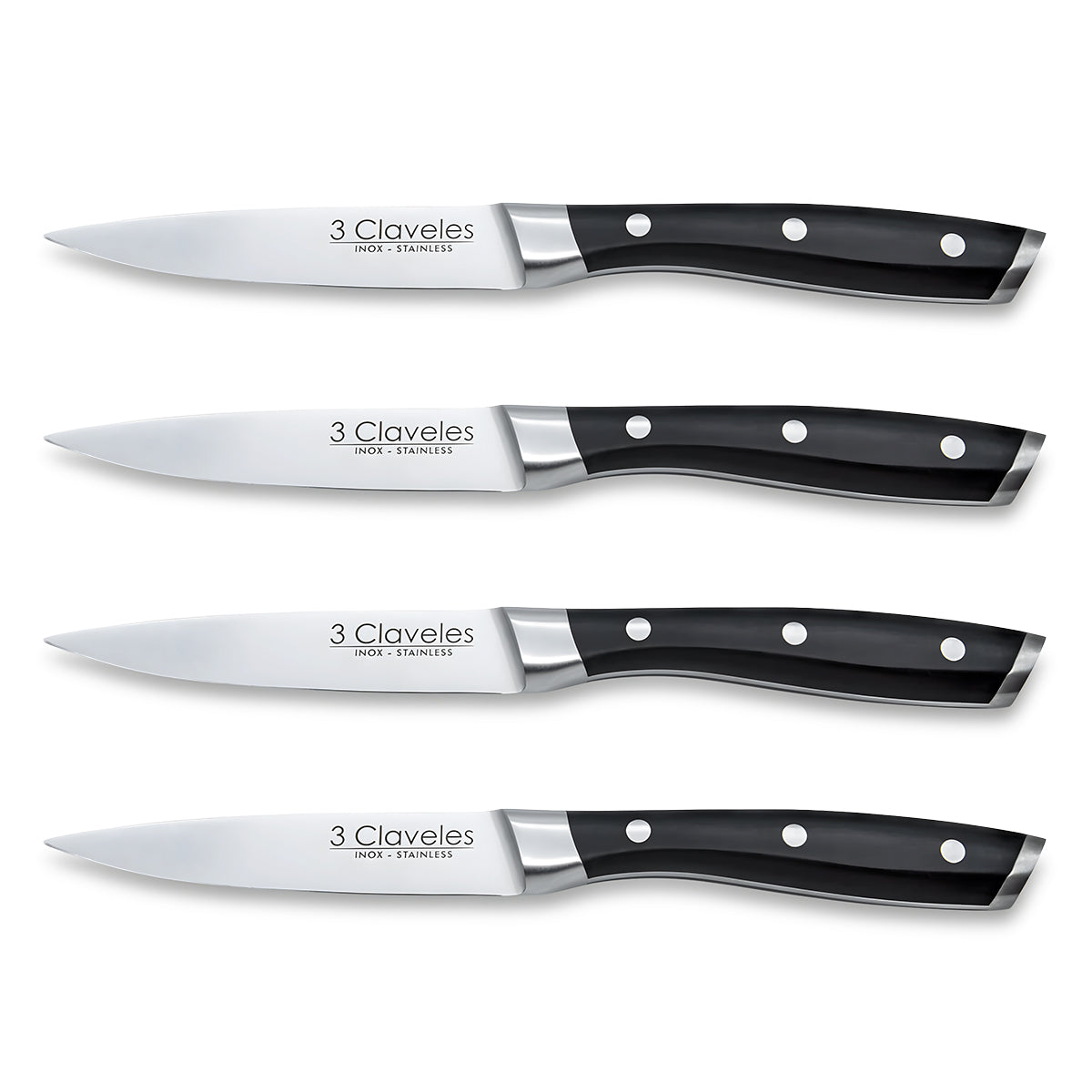 Juego profesional 3 Claveles de 4 cuchillos de cocina chuleteros de 11.5 cm - 4.5" con el filo liso para obtener un corte preciso y sin esfuerzo, cuchillo cocina delgado y fuerte que facilita el corte de filetes y carne ligeramente asada. Su fabricación forjada consigue un cuchillo de cocina profesional muy robusto y resistente a su uso, evitando así su desgaste y tener que estar afilándolo de forma muy continua.