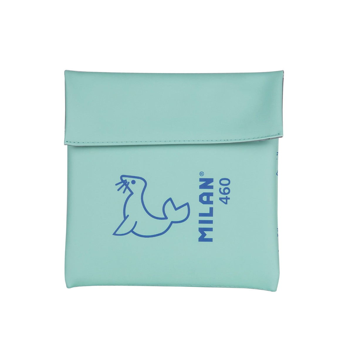 Bolsa isotérmica porta alimentos pequeña tipo sobre de 0.3L en color rosa con estampado de ballenas en color azul marino, de la Colección 460 since 1918, inspirada en los colores y diseño originales de sus gomas de borrar.