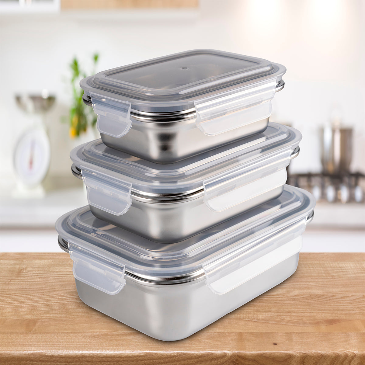 Lote de 2 Recipientes Rectangulares IBILI Keepklin fabricados en acero inoxidable 18/10 especial y con tapa de polipropileno, especialmente resistentes a la oxidación y las bacterias, aptos para microondas. Higiénicos, no transmite olores ni sabores a los alimentos. Fácilmente apilables y encajables entre sí en algunos formatos, ahorran espacio en tu cocina.