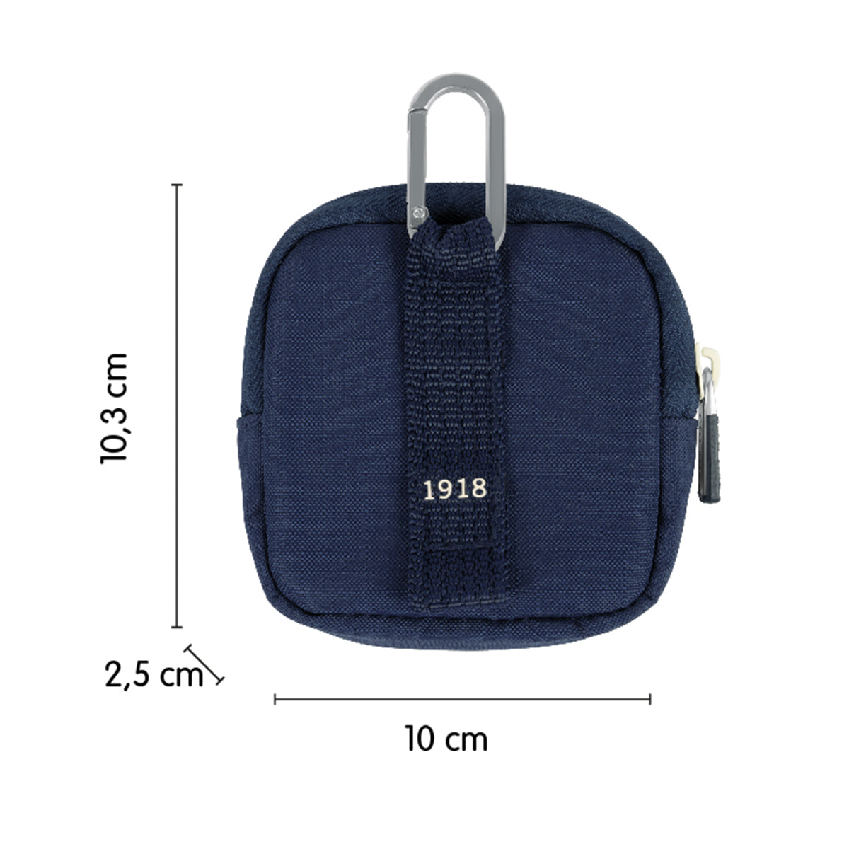 Monedero pequeño MILAN 430 de tela Ripstop de color azul para monedas y tarjetas con cierre mediante cremallera. Incluye un práctico mosquetón de aluminio para llevar las llaves o colgar el monedero a un bolso o mochila. Tiene una tira en la parte posterior para pasar un cinturón y llevar el monedero de forma cómoda y más segura. Colección 430 since 1918, inspirada en los colores y diseño originales de las gomas de borrar MILAN, fabricadas en España desde 1918. Cuidados: lavado a mano máx. 30°. No usar lejía. No usar secadora. No planchar.