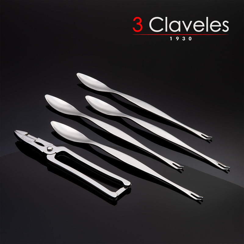 Lote de 6 piezas para marisco 3 Claveles que incluye 2 pinzas corta mariscos profesionales y 4 tenedores para marisco. Fabricados en acero inoxidable forjado con diseños ergonómicos para un agarre y uso cómodos.