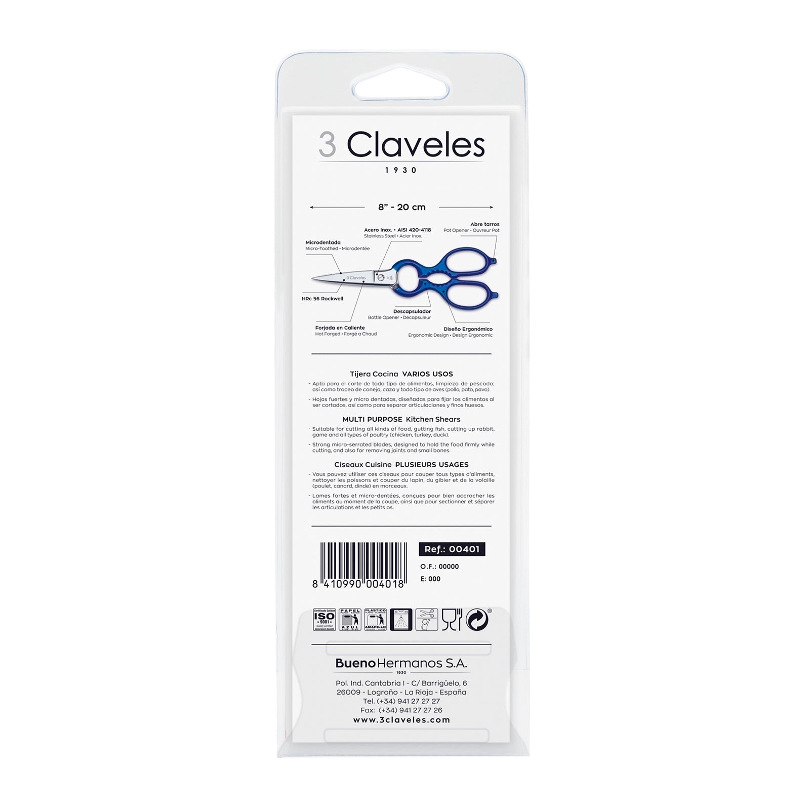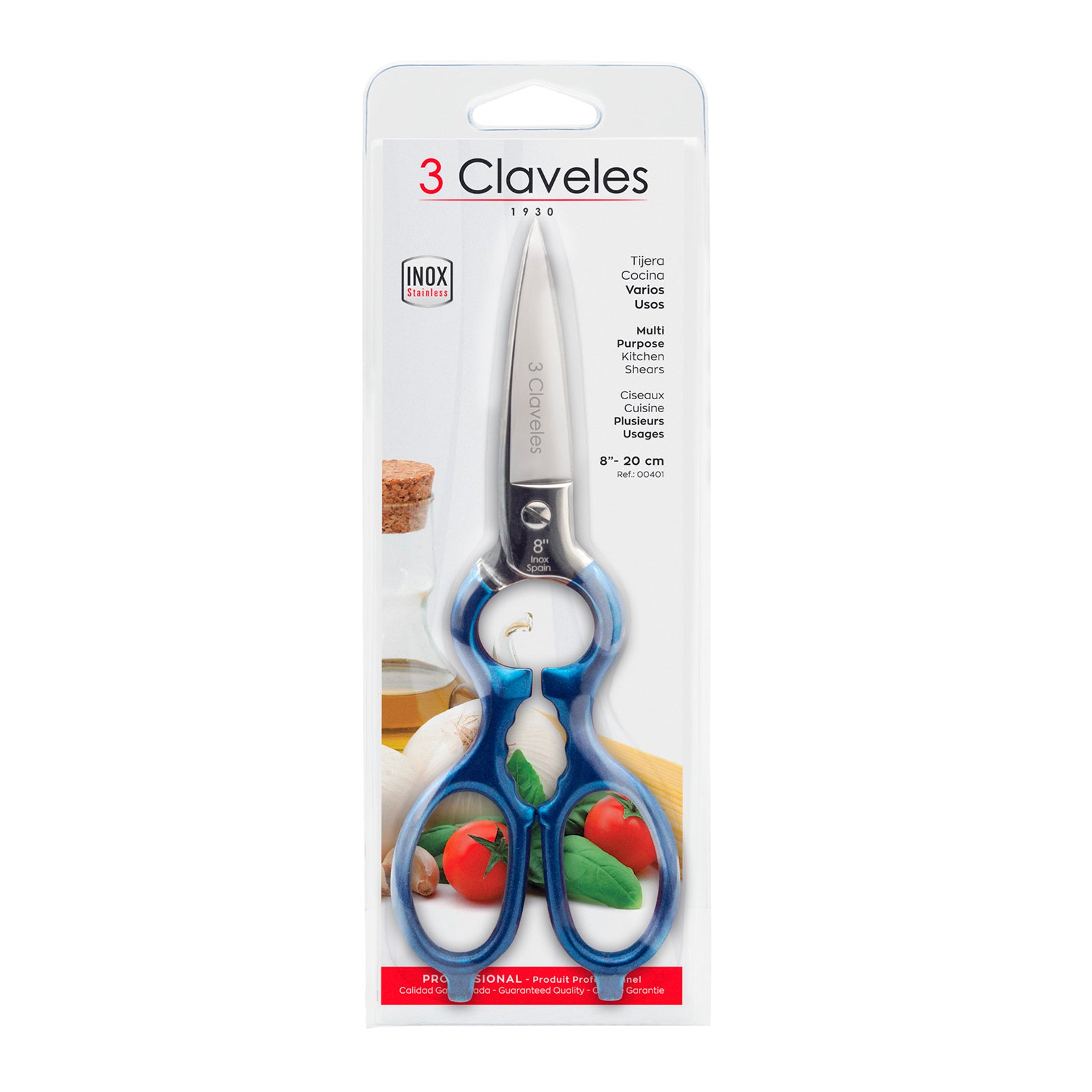 Tijeras de cocina profesionales para varios usos 3 Claveles 401, aptas para el corte de todo tipo de alimentos. Forjadas en caliente con acero inoxidable de alta calidad, ligeras y muy cómodas. Filo dentado para fijar los alimentos al ser cortados, así como para separar articulaciones y huesos finos. Alta durabilidad y gran rendimiento de corte. Dedales simétricos, lo que las hace aptas para diestros y zurdos.