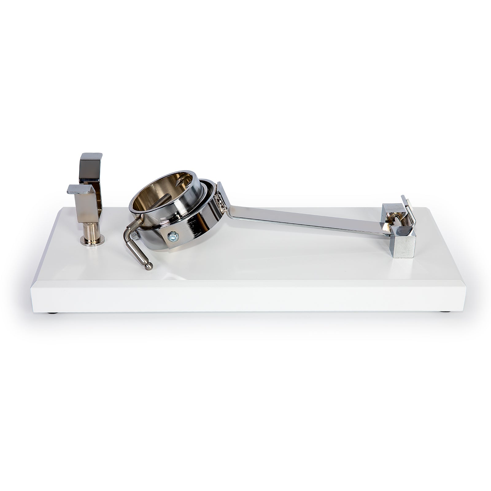 Soporte jamonero plegable con cabezal giratorio modelo Denali con base DM lacada en blanco. Su forma y diseño facilitan el corte del jamón. Los herrajes son de acero con acabado cromado brillante y los pinchos son de acero inoxidable AISI-304.