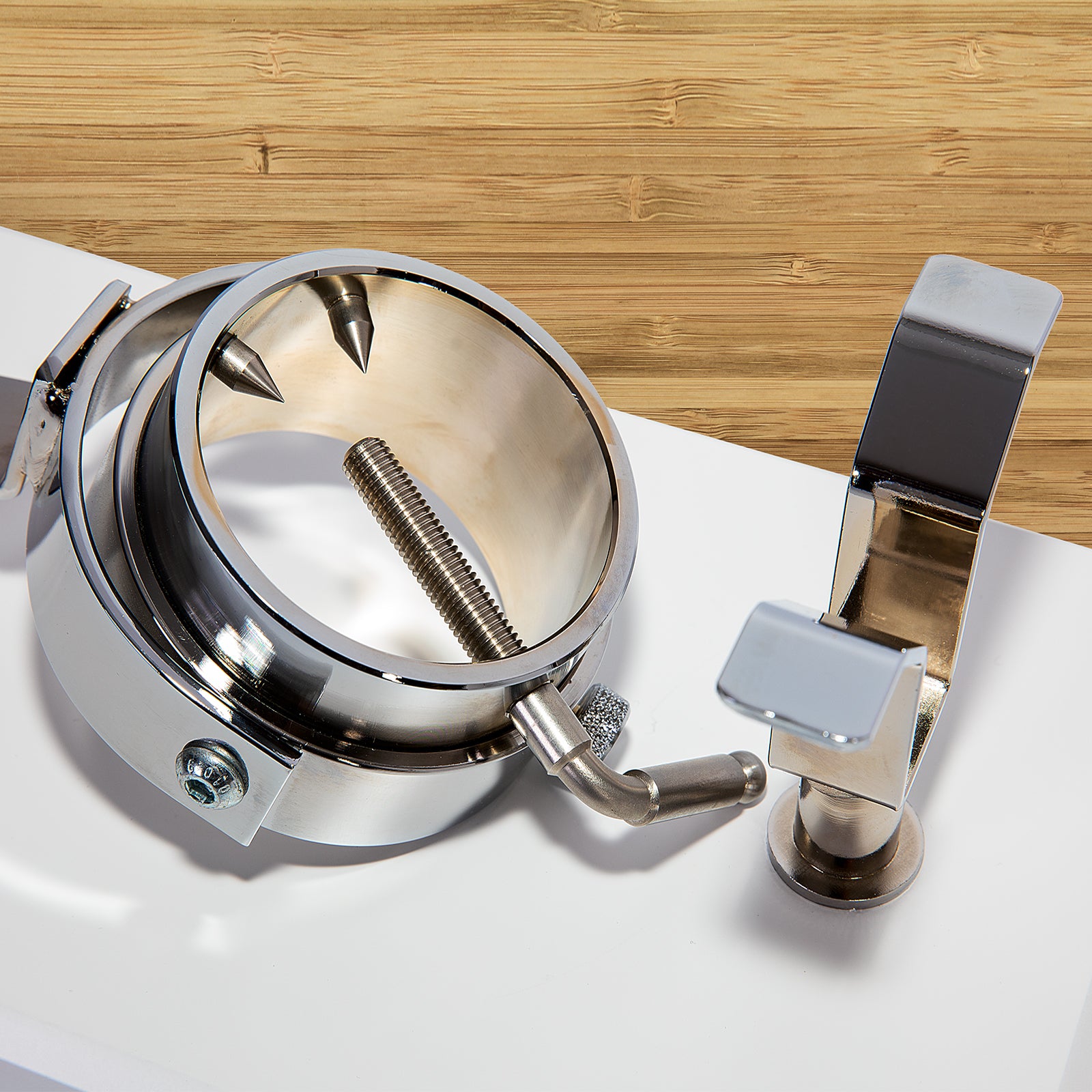 Su sistema de casquillos giratorios permiten girar el jamón los grados que se desee sin necesidad de soltar la pata. La sujeción de la punta tiene forma de V y no lleva pincho para evitar perforar el jamón y/o dañarlo.