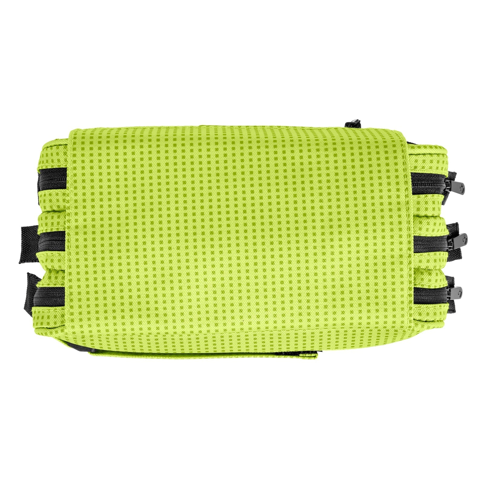 Estuche portatodo triple de amplios apartados y gran capacidad en formato rectangular. Cuenta con 3 cremalleras principales y una solapa exterior con tirador de tela y cierre de velcro. Además, cuenta con una tira trasera para poder colgarlo y con espacio para tus datos.