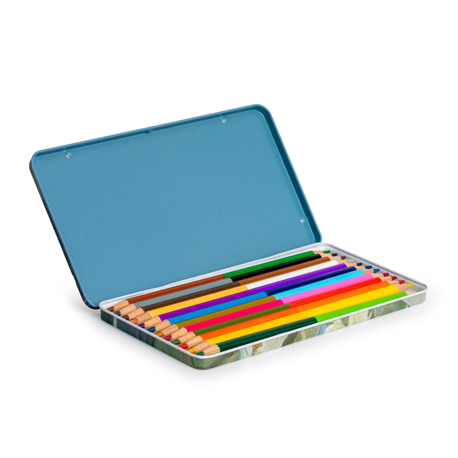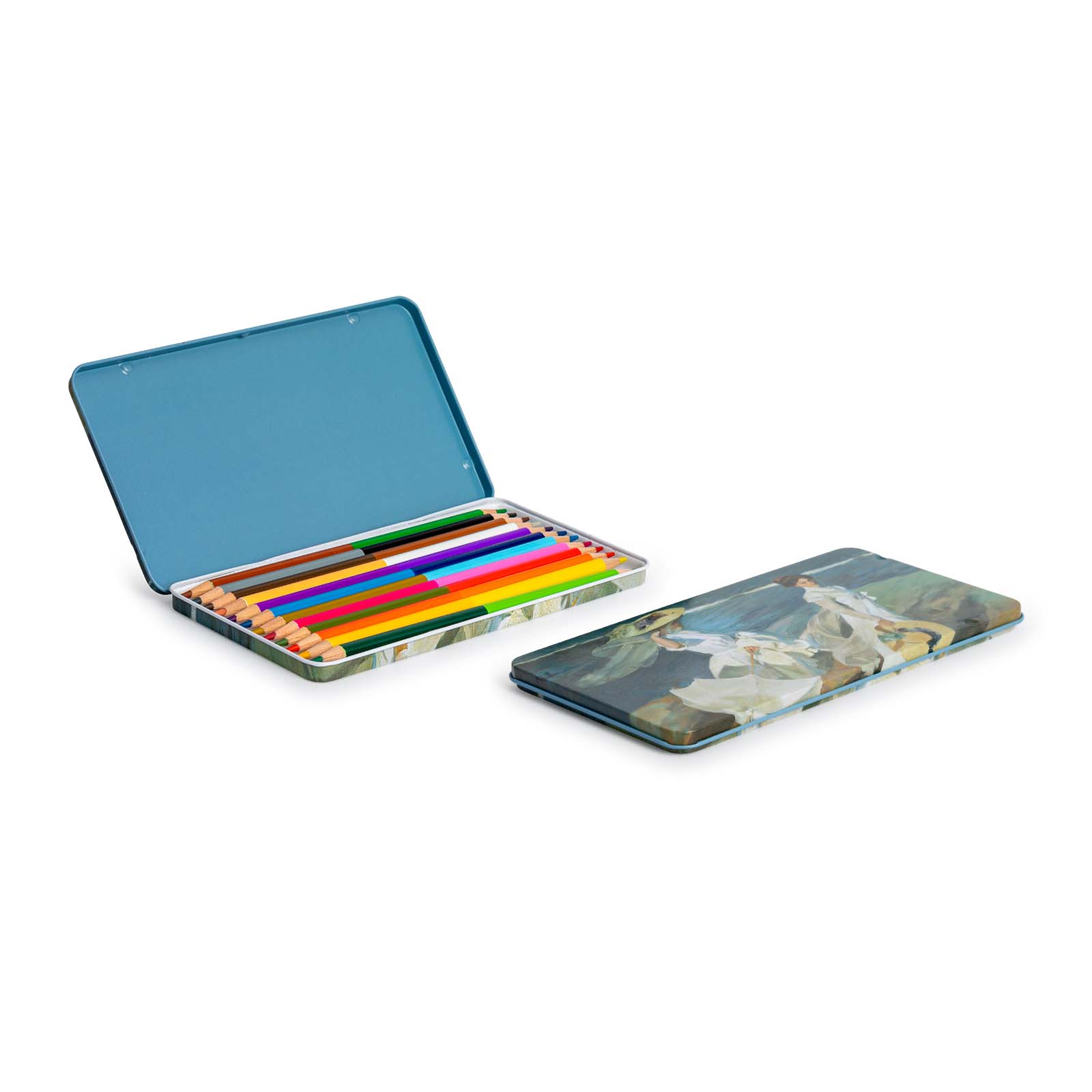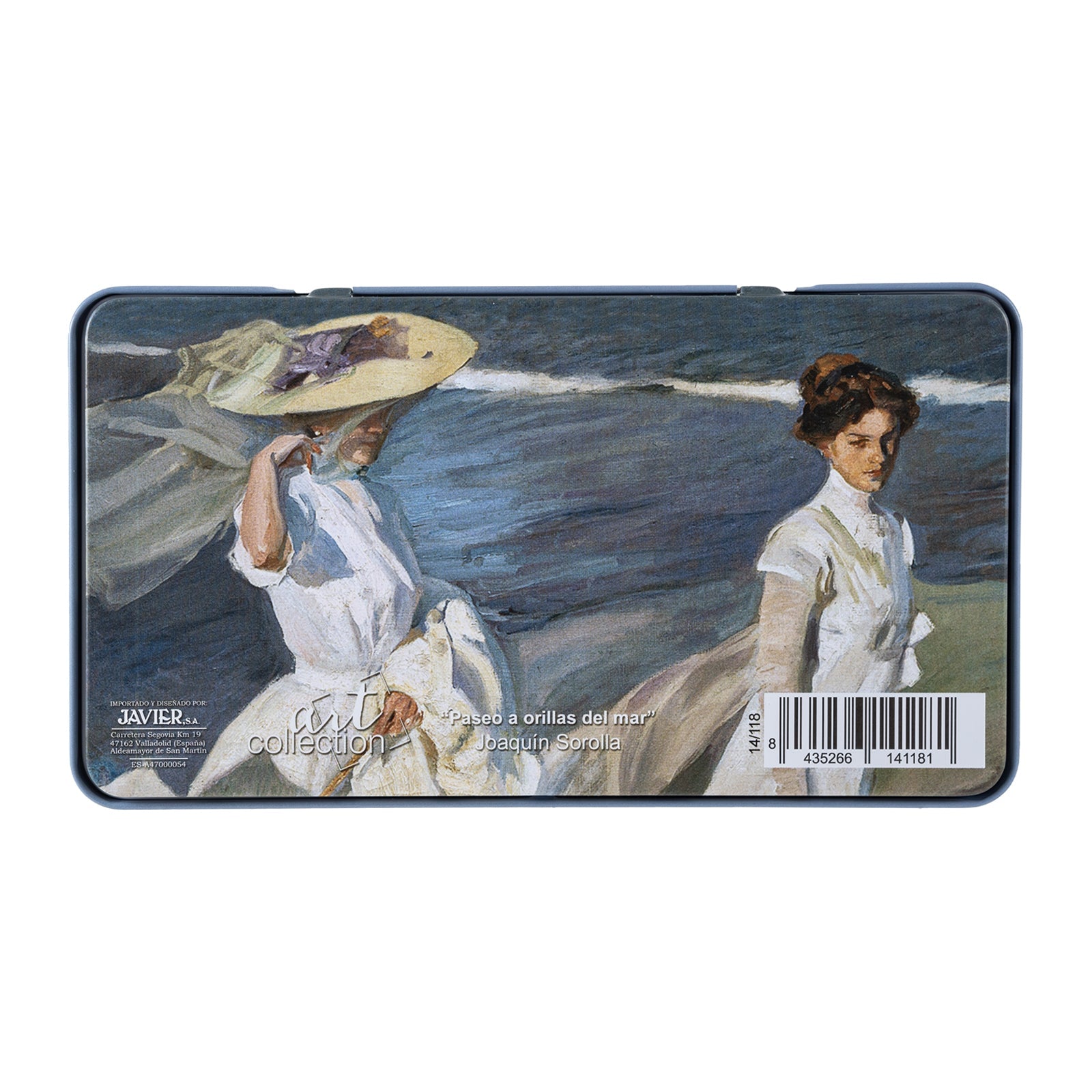 Caja metálica con 12 lápices de color con doble punta JAVIER Señoras Playa presentados en un estuche decorado con motivos de la colección. Están fabricados en madera y, al ser dobles, dispondrás de 24 colores vivos distintos en menos espacio.