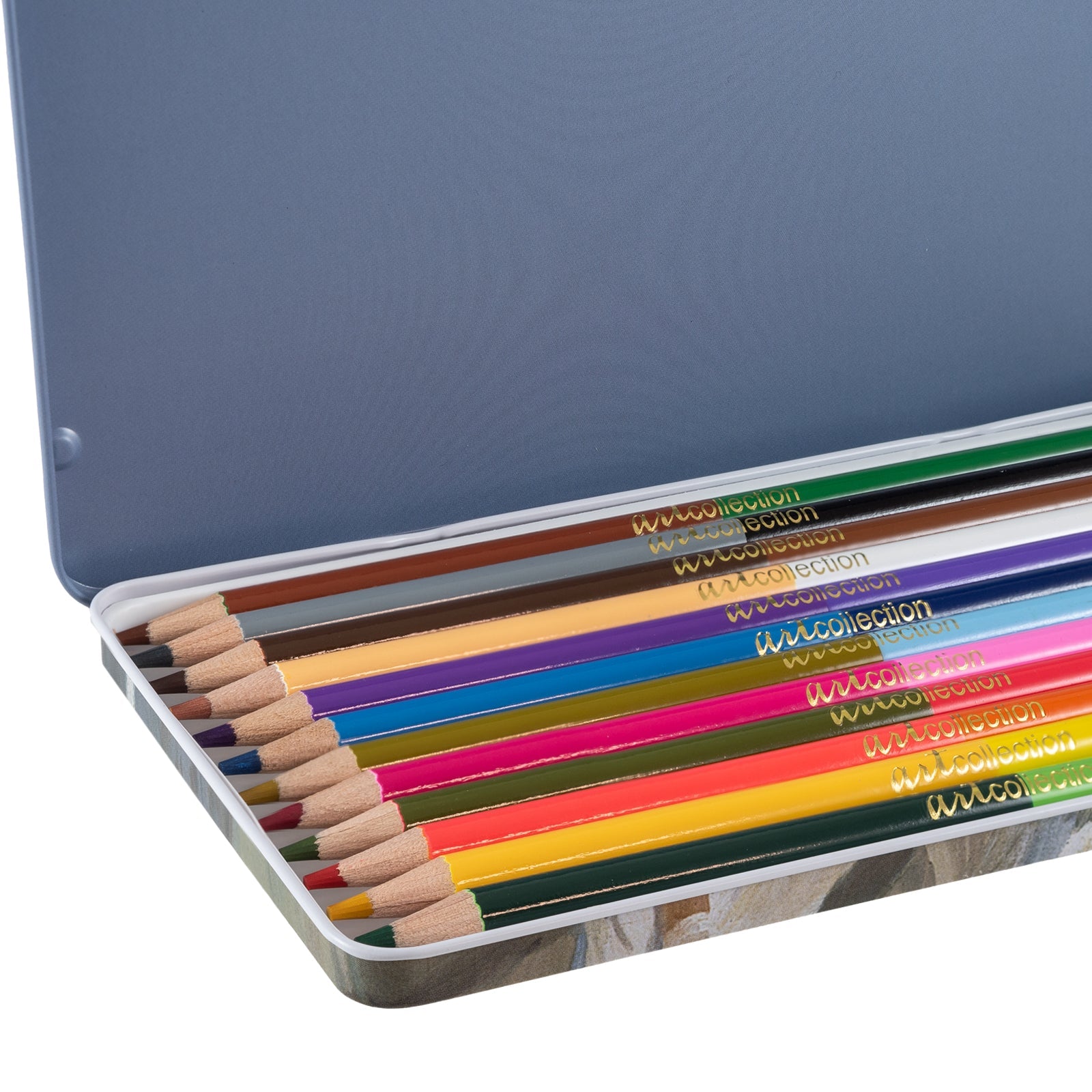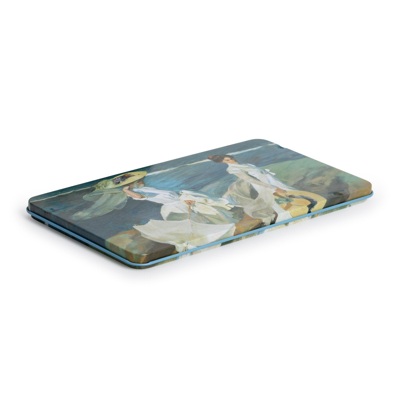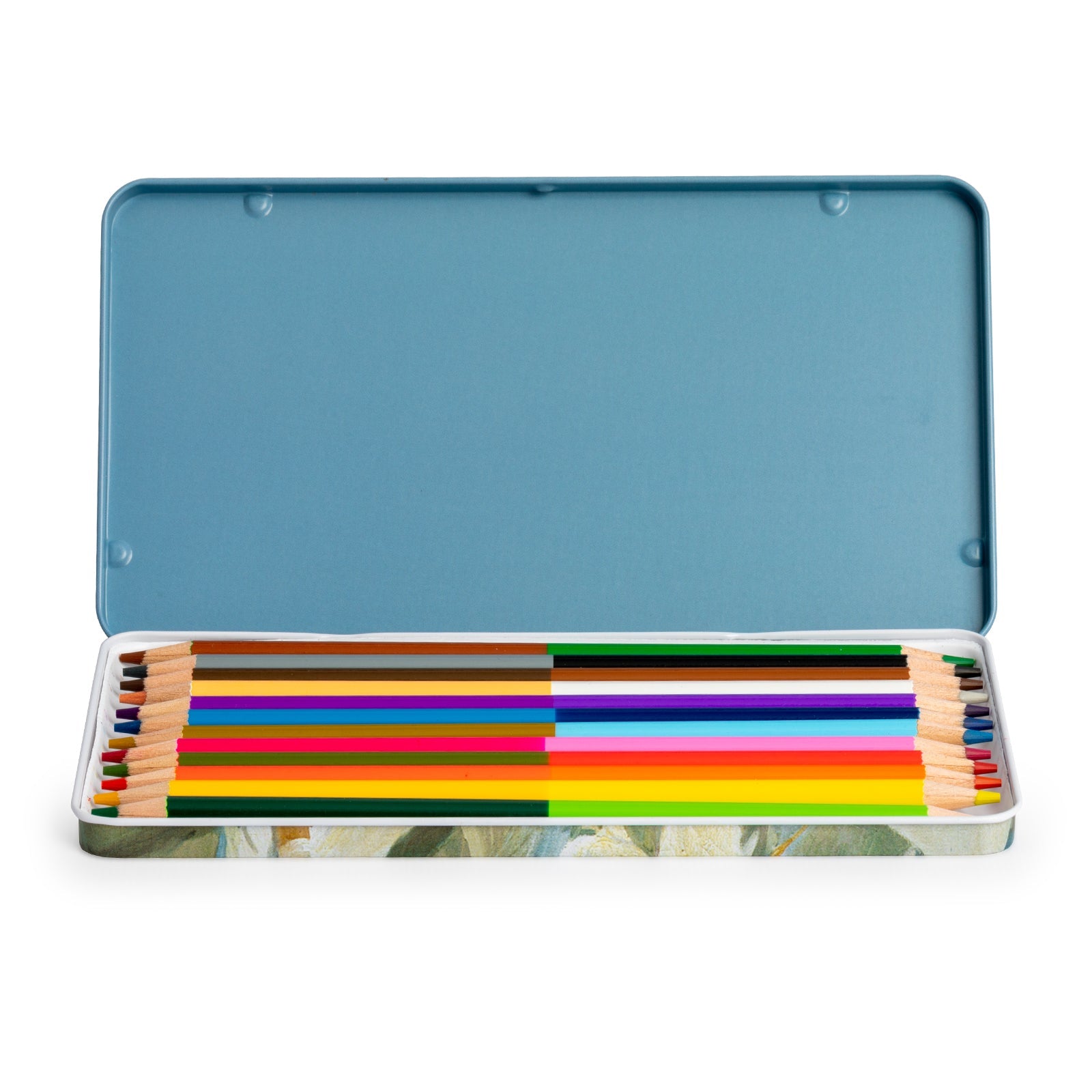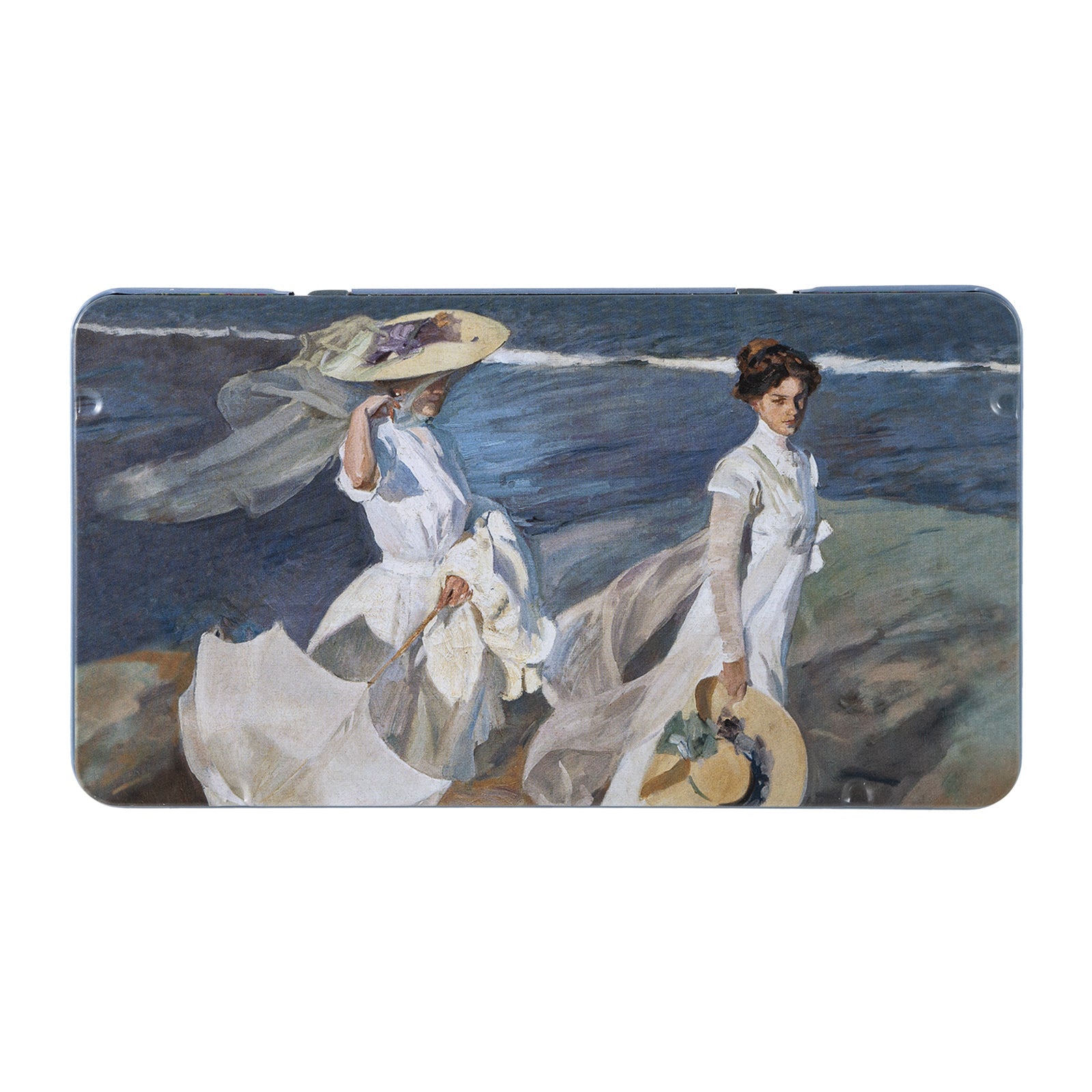 Caja metálica con 12 lápices de color con doble punta JAVIER Señoras Playa presentados en un estuche decorado con motivos de la colección. Están fabricados en madera y, al ser dobles, dispondrás de 24 colores vivos distintos en menos espacio.