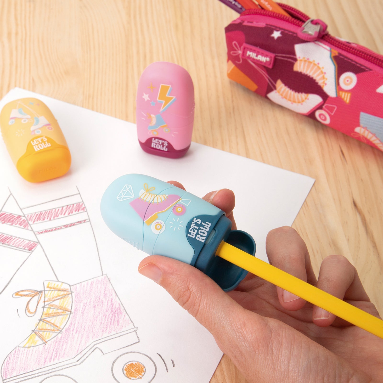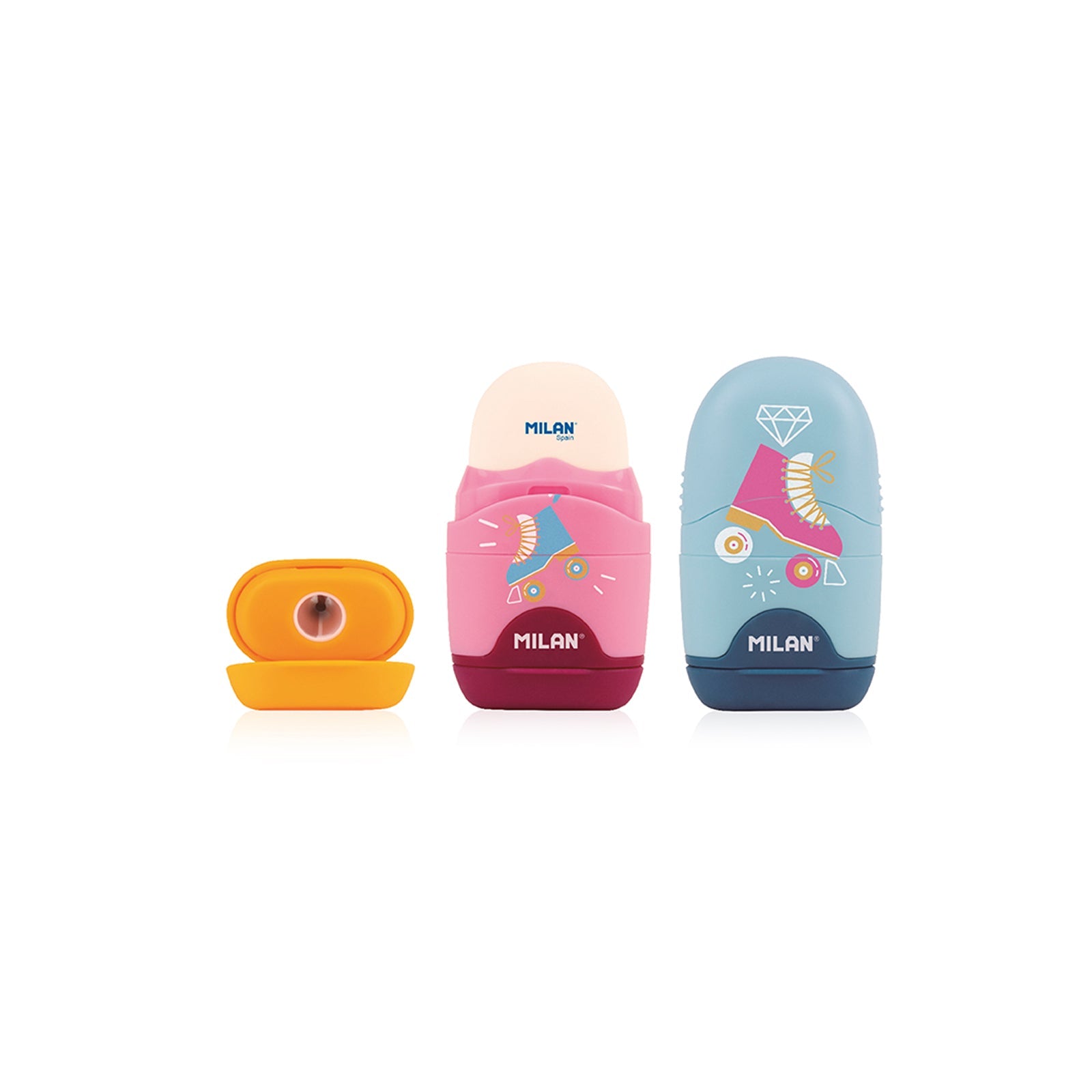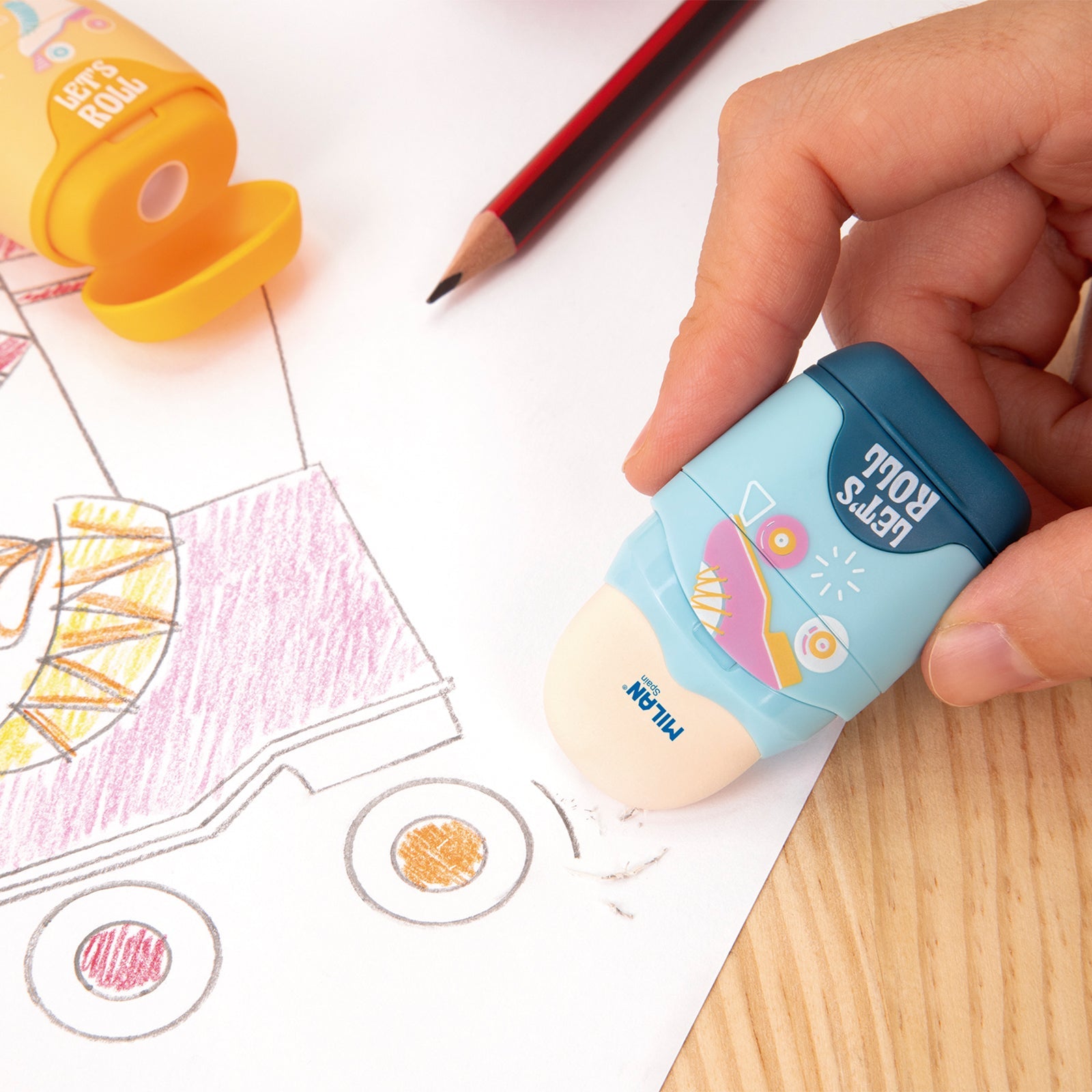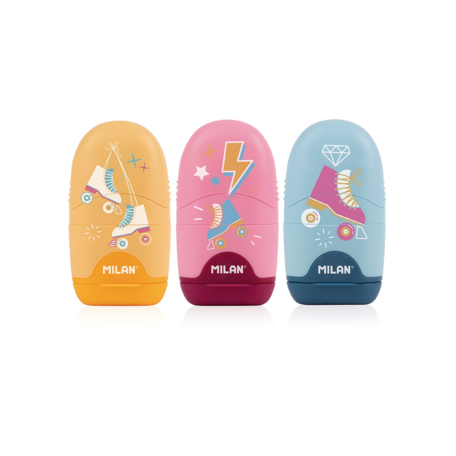 Expositor de 16 afilaborras Milan Capsule Serie Especial Roller, una combinación de goma de borrar y sacapuntas con depósito. La goma ovalada es suave de caucho sintético tipo 'miga de pan' y el sacapuntas dispone de una cuchilla de acero afilada y resistente, ideal para todo tipo de lápices.