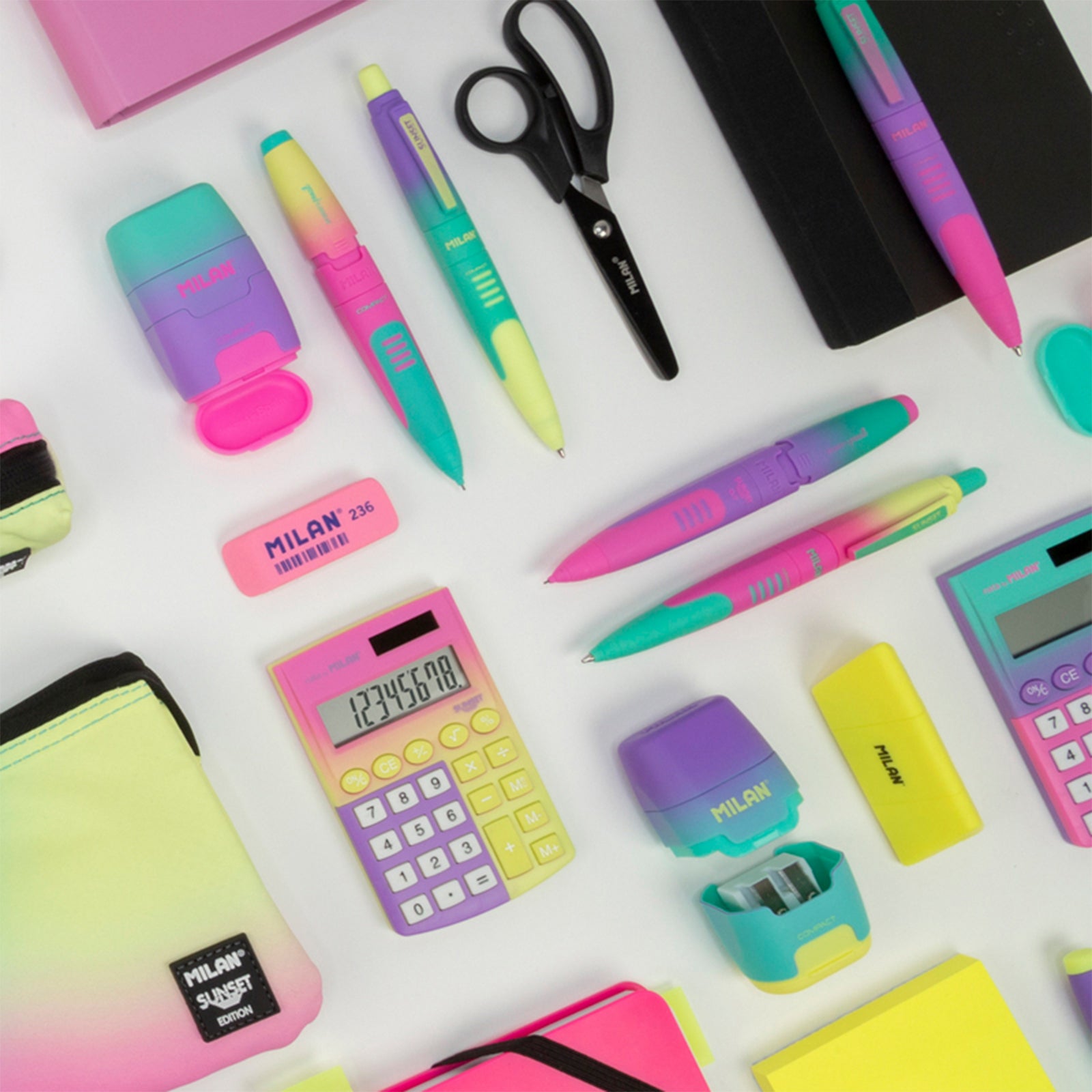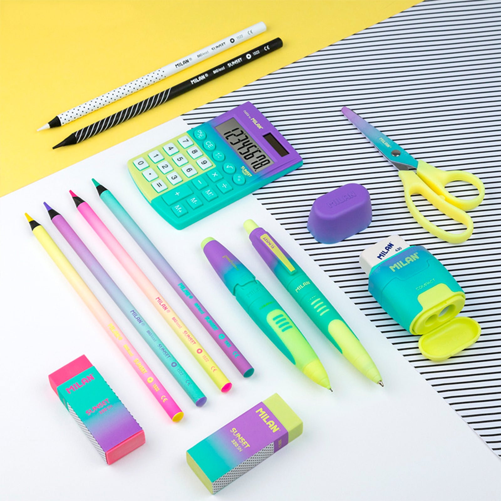 Disponible en 4 colores surtidos: amarillo, lila, rosa y verde. Diseño original creado por el departamento de I+D de MILAN. Gomas y minas de recambio disponibles.