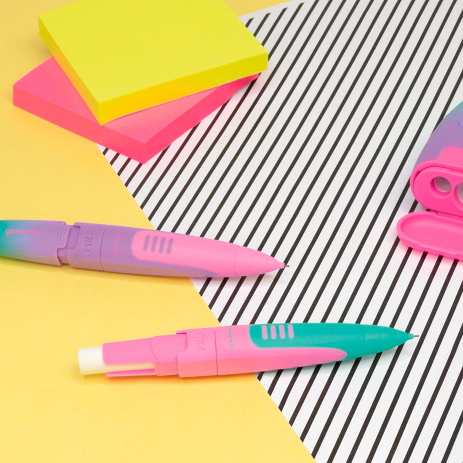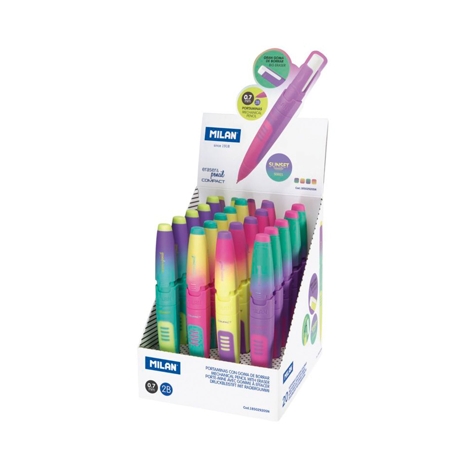 Caja Expositora de 20 Lápiz portaminas con goma Eraser and Pencil COMPACT de la serie MILAN Sunset. Mina de grafito de 0.7 mm de dureza 2B, que ofrece un trazo de líneas gruesa y suave, que facilita la escritura y es también apropiada para el dibujo artístico. Goma MILAN extra-grande.