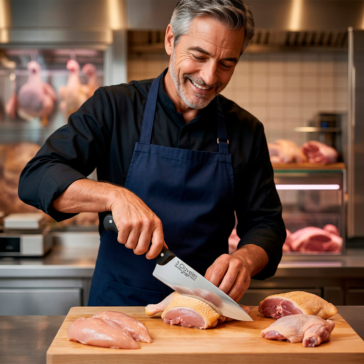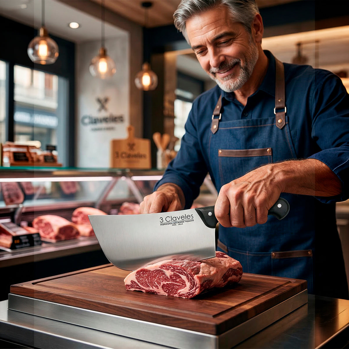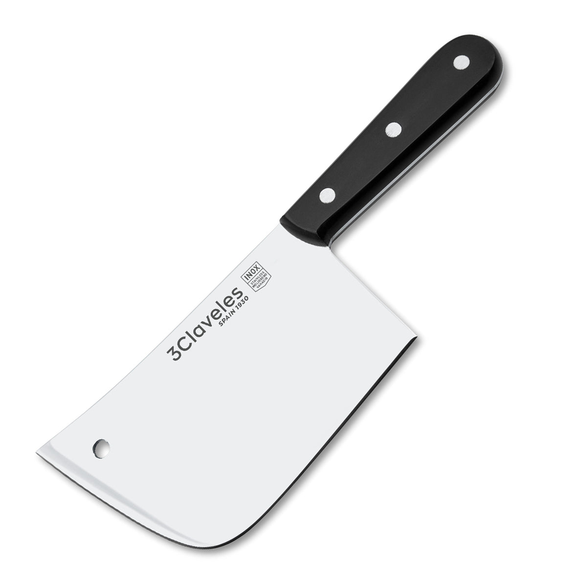 Hachuela profesional Para Filetar con hoja ancha 3 Claveles, fabricada en acero inoxidable AISI 420 con dureza Rockwell 56 y espesor de 3 mm. Diseñada para cortar chuletas y trocear piezas de carne y pescado con precisión y estabilidad. Mango ergonómico de POM (polioximetileno) negro que combina durabilidad y elegancia. Acabado pulido mate que facilita el mantenimiento. Apta para diestros y zurdos, y segura para lavar en lavavajillas. Peso aproximado: 800 g. Incluye funda protectora para la hoja.