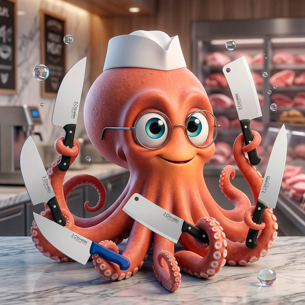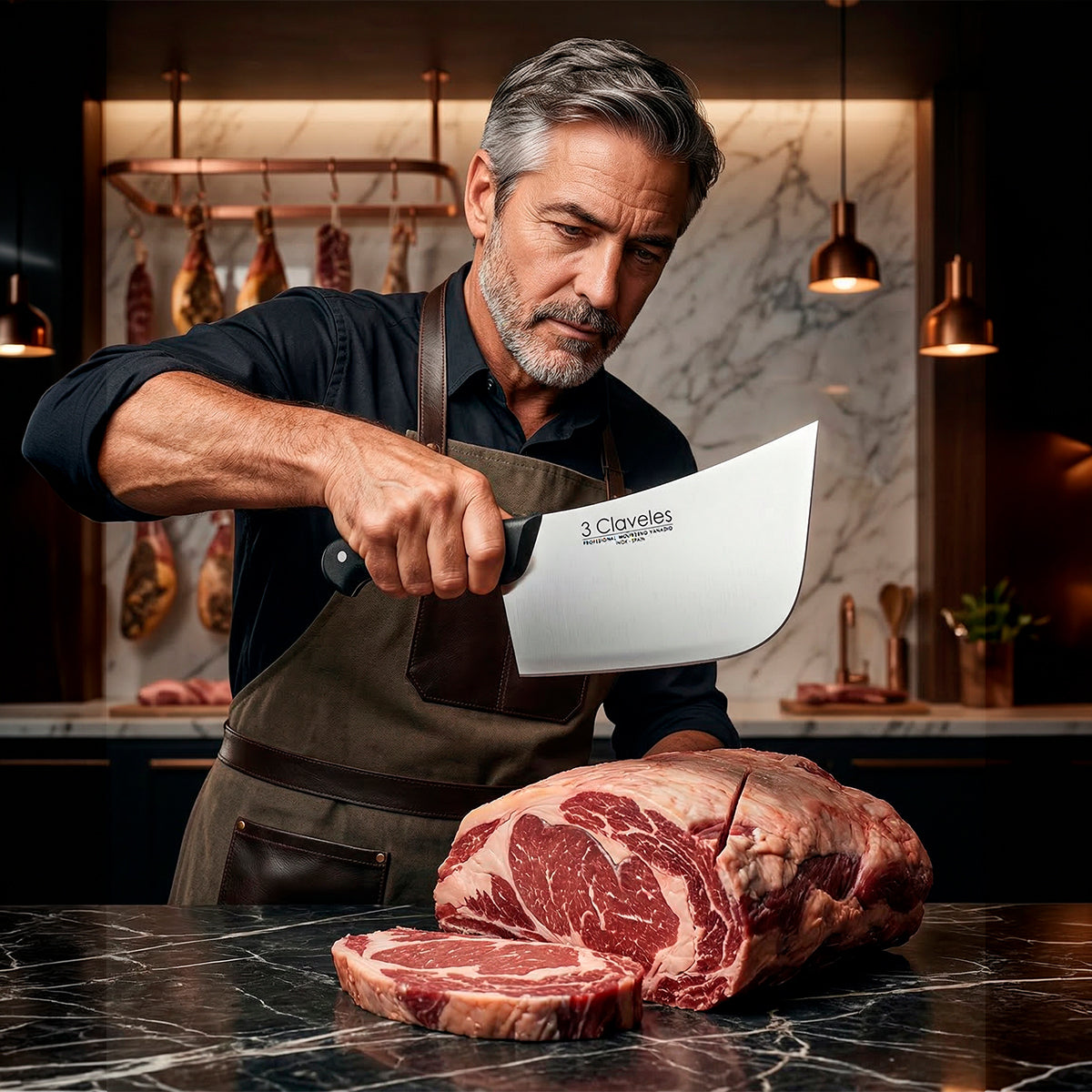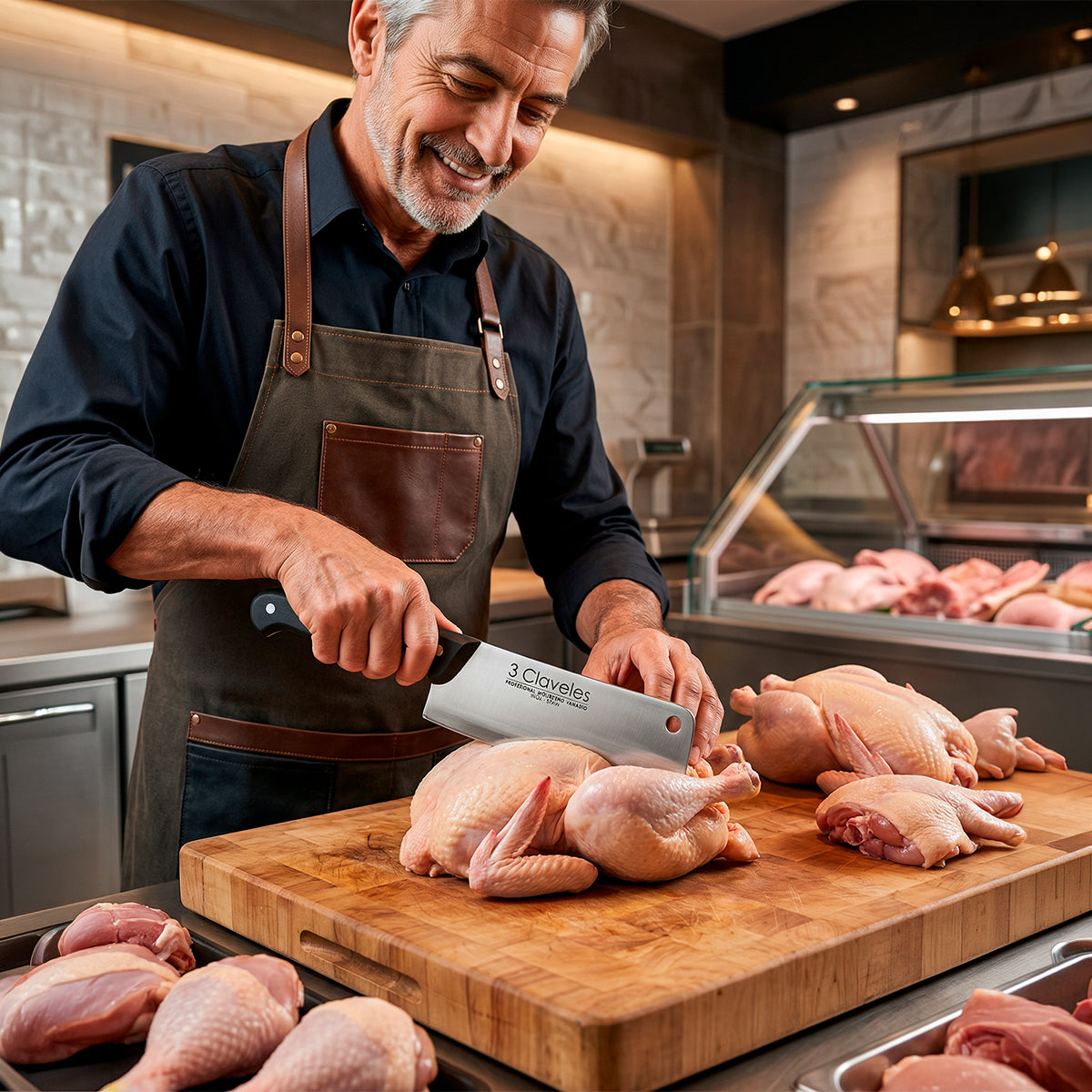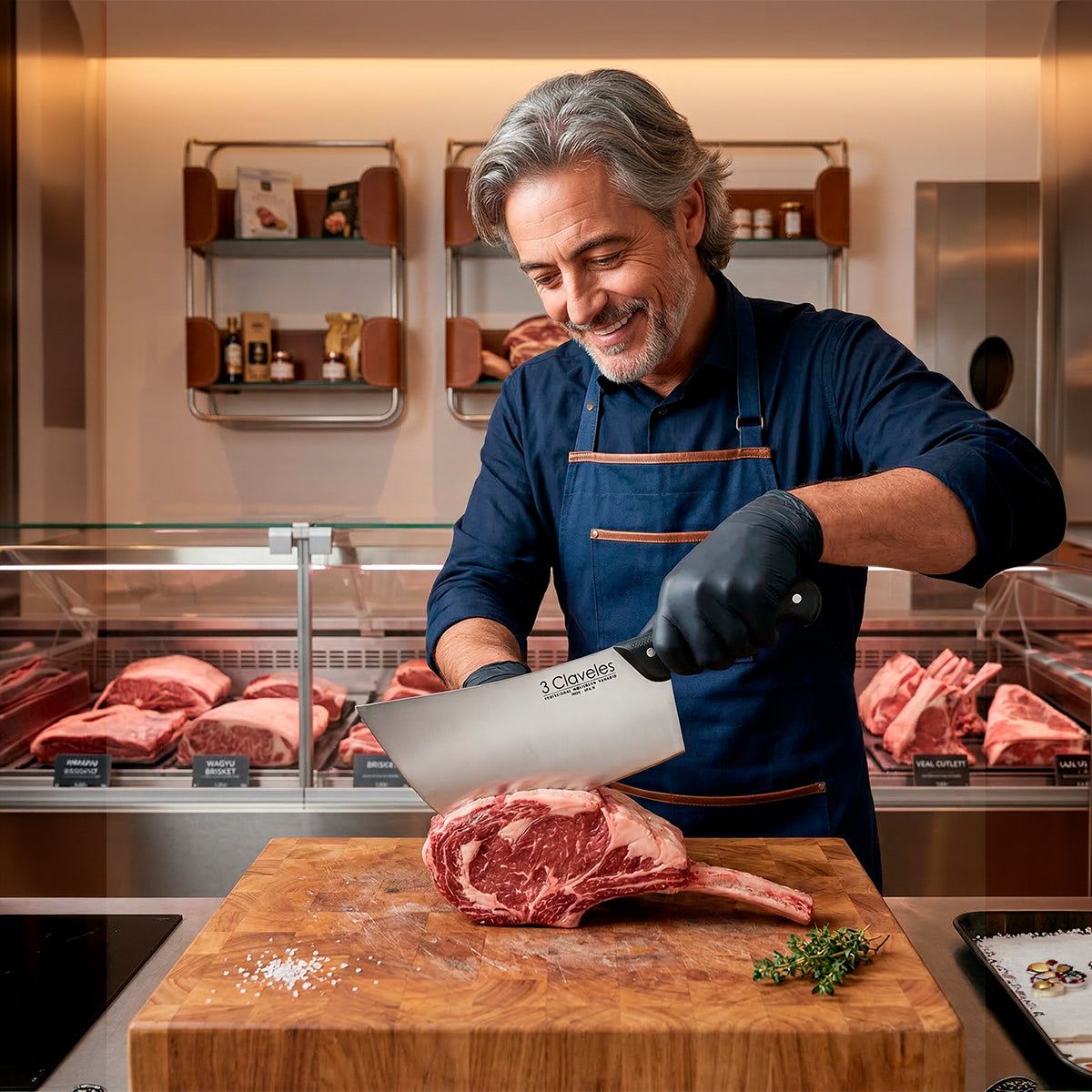 Hachuela profesional Para Filetar con hoja ancha 3 Claveles, fabricada en acero inoxidable AISI 420 con dureza Rockwell 56 y espesor de 3 mm. Diseñada para cortar chuletas y trocear piezas de carne y pescado con precisión y estabilidad. Mango ergonómico de POM (polioximetileno) negro que combina durabilidad y elegancia. Acabado pulido mate que facilita el mantenimiento. Apta para diestros y zurdos, y segura para lavar en lavavajillas. Peso aproximado: 800 g. Incluye funda protectora para la hoja.