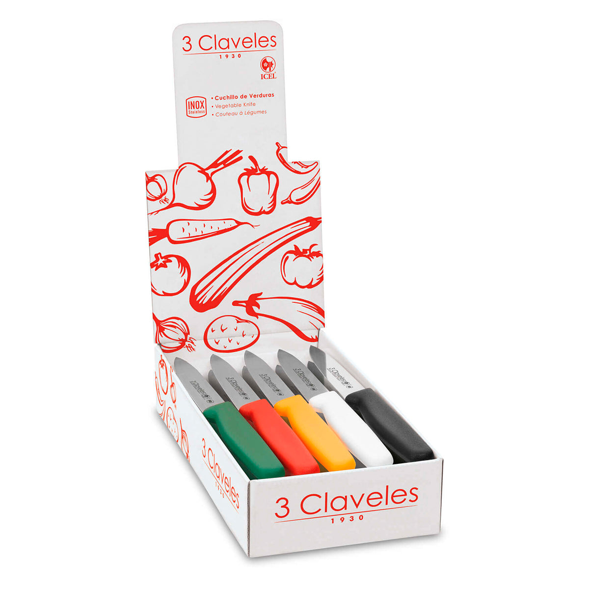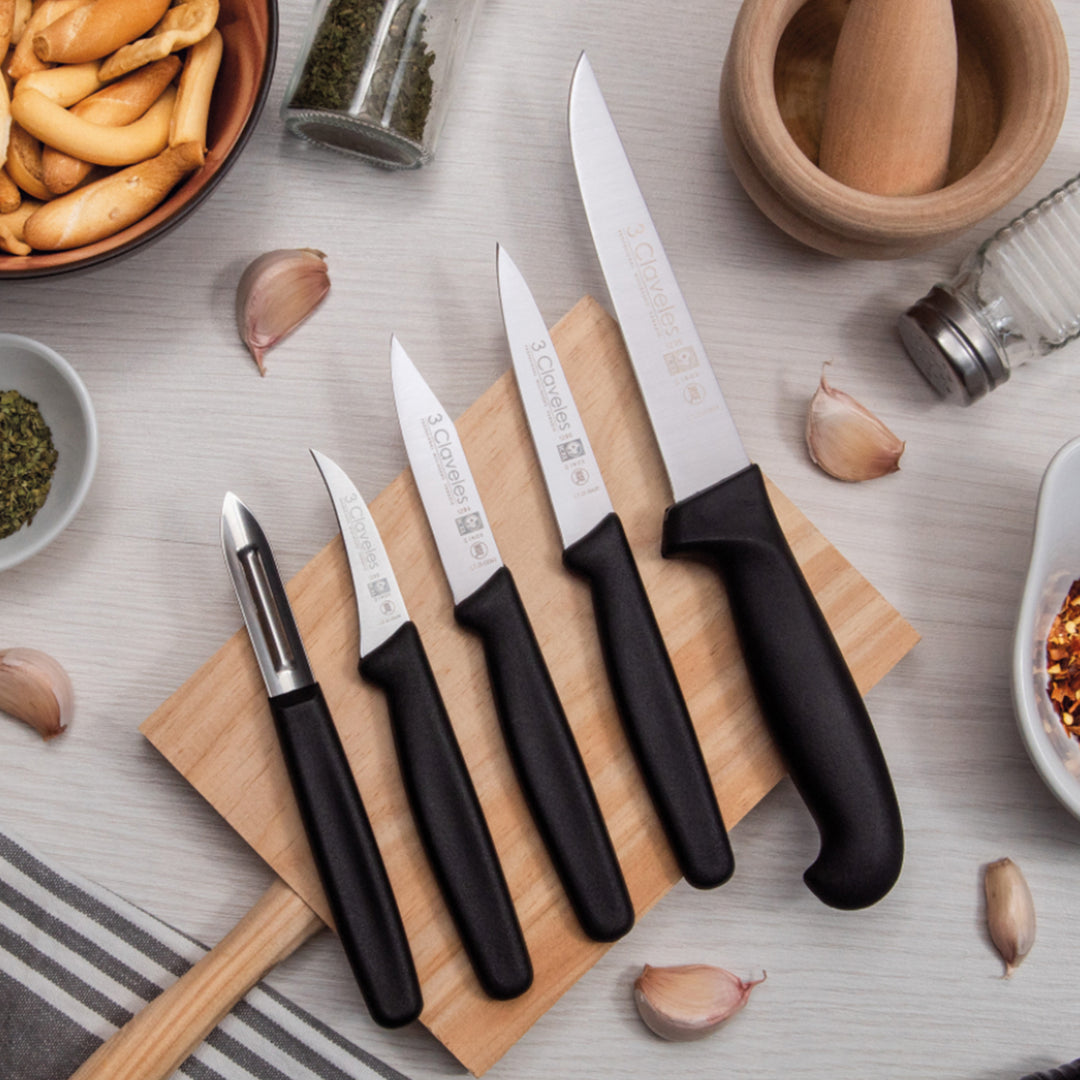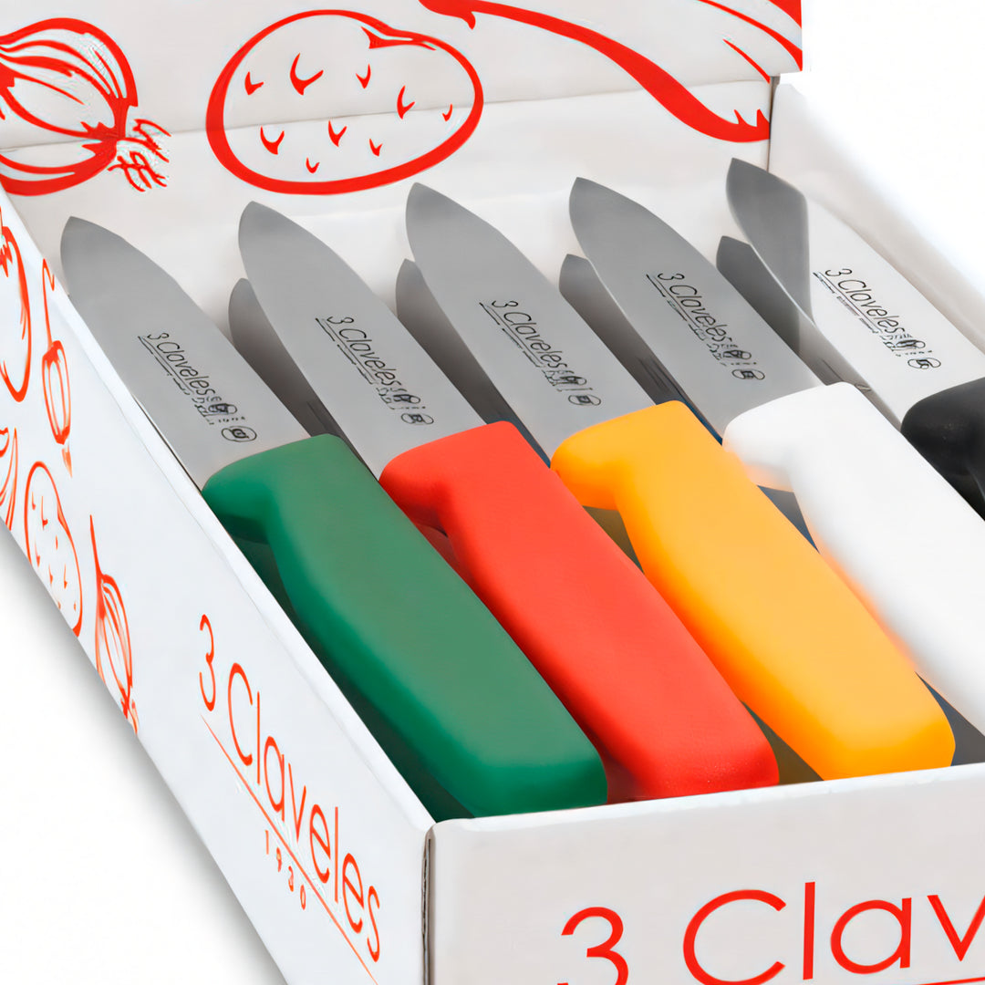 Cuchillo verduras 3 Claveles Light ref. 1216, con acabado pulido mate. Hoja de Acero Inoxidable Molibdeno Vanadio. Certificación NSF Internacional (National Sanitary Foundation). Punta central delgada.