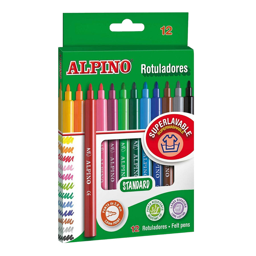 El rotulador de los más pequeños: El set de 12 rotuladores de Alpino, está pensado para los más pequeños de la casa. Su punta de 3mm los hace perfectos para iniciarse en el mundo del dibujo y la pintura. Ofreciendo una gama de colores vivos y brillantes con tinta súper lavable para que puedan disfrutar sin límites. Disfruta coloreando