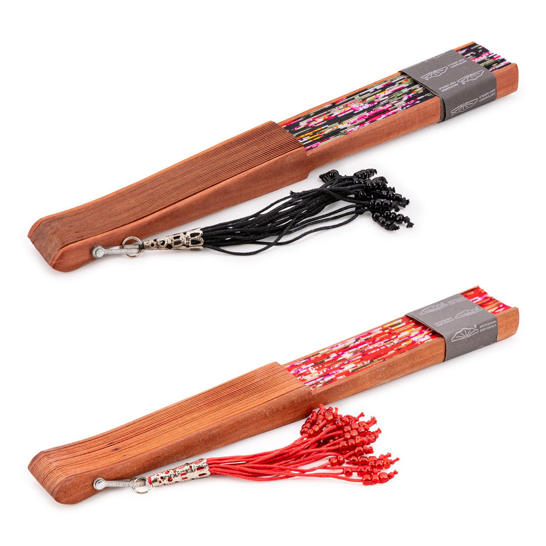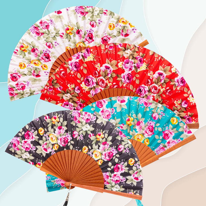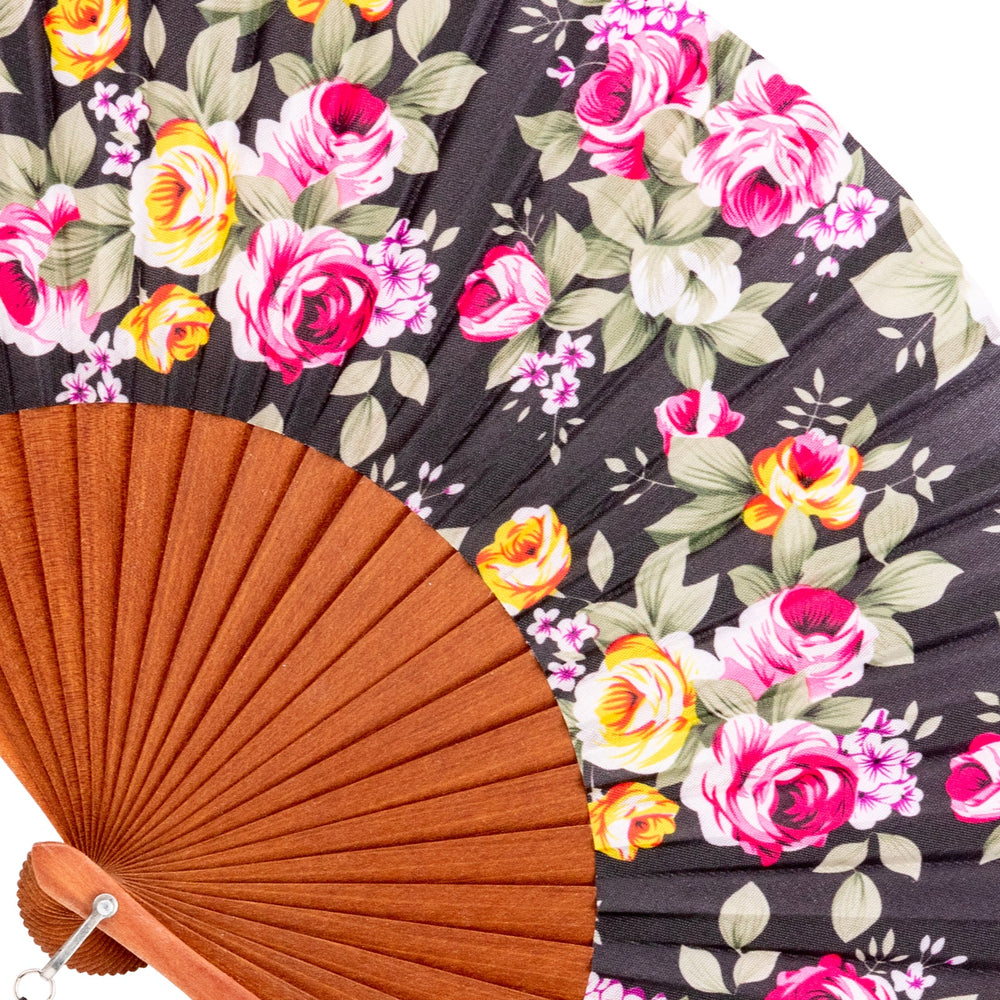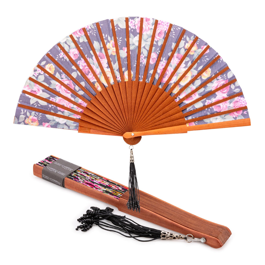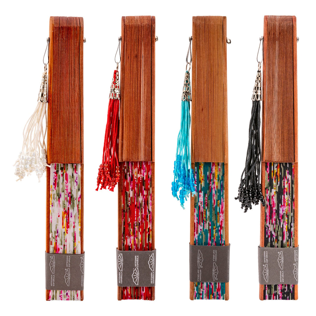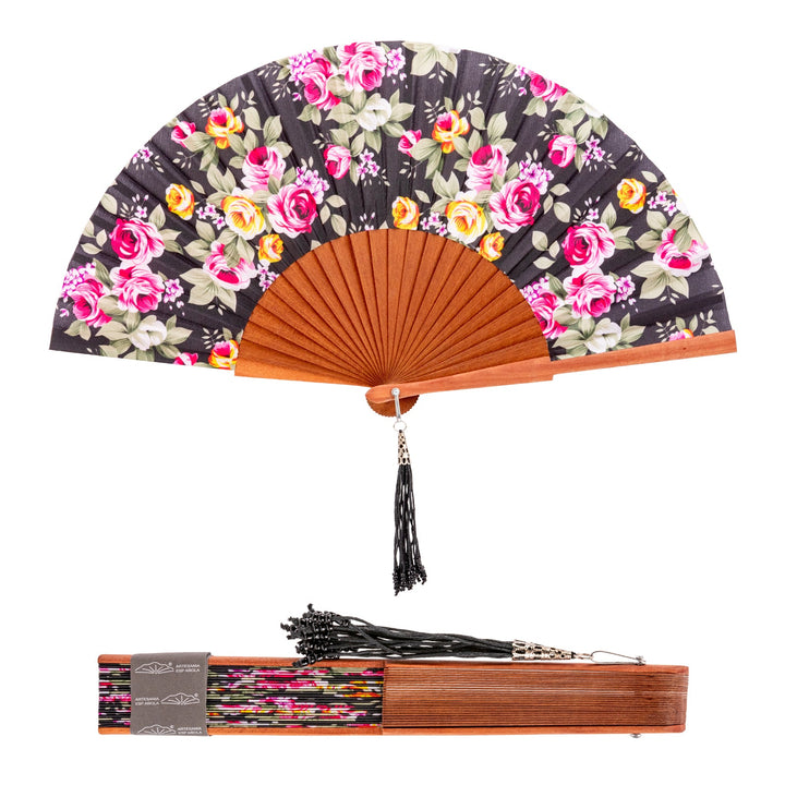 Abanico plegable de la colección Flores de Abanicos Aparisi. Está fabricado con varillas de madera y tela estampada por sublimación. El abanico viene con unos flecos a juego como adorno, ¡perfecto para regalar!